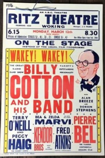 The Ritz, Woking: Billy Cotton and his Band w/ Terry O’Neil and Peggy Haig, Bea & Zelda Marvi, Kendor Bros., Fred Atkins, and Pierre Bel.