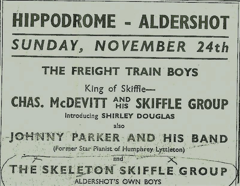 Hippodrome, Aldershot: The Freight Train Boys, Chas McDevitt and his Skiffle Group, Johnny Parker and his Band, and The Skeleton Skiffle Group.