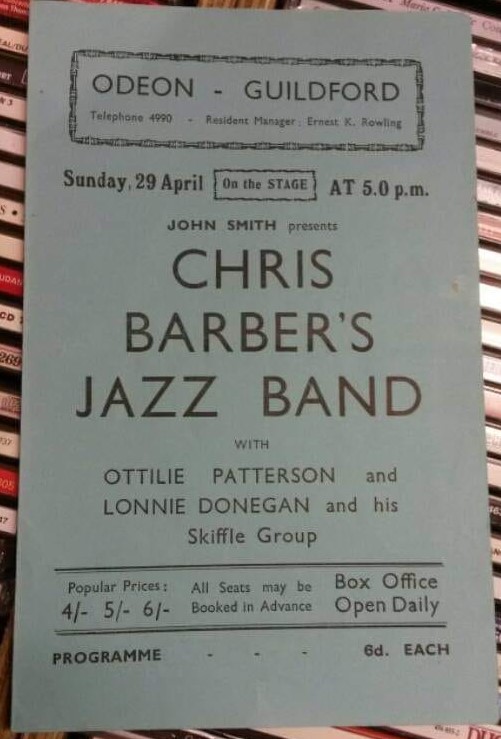 Odeon, Guildford: Chris Barber’s Jazz Band w/ Ottilie Patterson and The Lonnie Donegan Skiffle Group in the afternoon and The Eric Delaney Band in the evening.