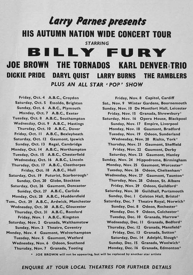 Odeon, Guildford: Billy Fury w/ The Tornados, Karl Denver Trio, Dickie Pride, Daryl Quist, Larry Burns, and The Ramblers (Larry Parnes Package Tour)