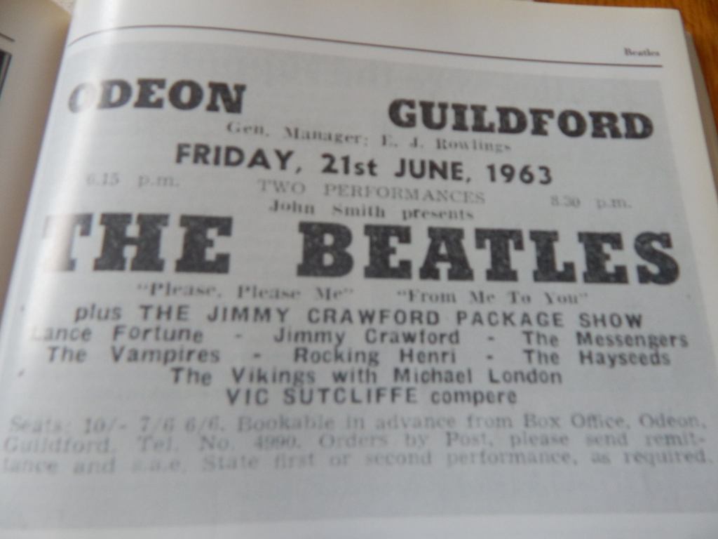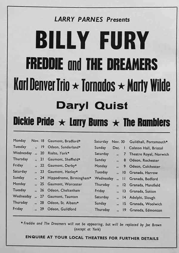 Odeon, Guildford: Joe Brown w/ Susan Maughan, The Tornados, Eden Kane, Shane Fenton & The Fentones, Jess Conrad, Rolf Harris, Peter Jay & The Jaywalkers, Daryl Quist, Peter Lodge, Mike & Tony Nevitt, and The Diggeroos