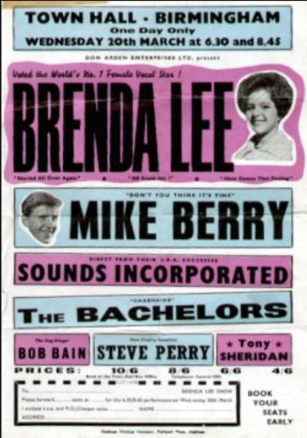 Town Hall, Birmingham: Brenda Lee w/ Mike Berry & The Outlaws, Tony Sheridan, The Bachelors, Steve Perry, and Sounds Incorporated