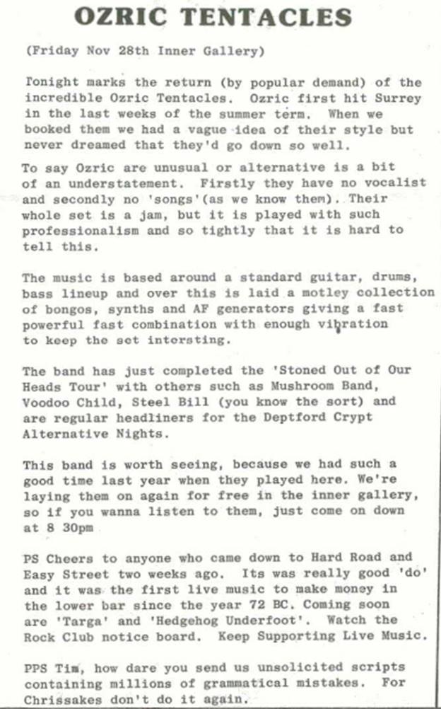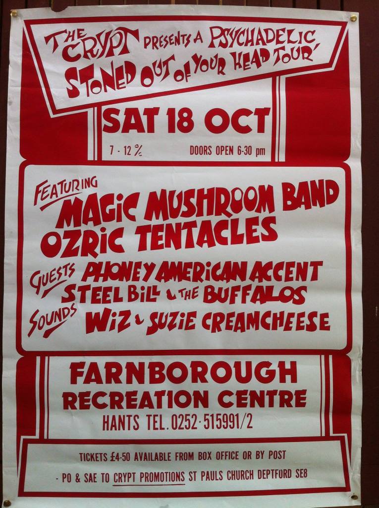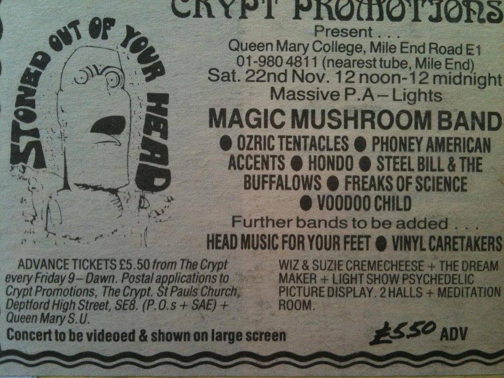 In ’85 the band were part of Guildford Live Aid along with LongPig and other bands. On 18 July ’86 the band supported Phoney American Accents at The Crypt, Deptford along with The Unknown Colours. Ten days later, on 28 July ’86, Steel Bill and The Buffalos were at the The Old Schoolhouse, Woking, with The Lost Prophets (not Pontypridd’s pride and joy – they arrived 11 years too late). Teaming up with Ozric Tentacles promoters in late ’86 saw the Bill’s on the bill for a couple of gigs on the Stoned Out of Our Heads tour, including The Crypt, at the Recreation Centre, Farnborough where they co-supported with Phoney American Accents and The Magic Mushroom Band. This was followed by supporting Voodoo Child (psychedelic rock group who released one album: “Acid Tales And Mermaids” in 1986 on Aftermath) at University of Surrey on 31 October. In November that year Steel Bill and The Buffaloes headlined a Buzz Club at the West End Centre. Aldershot, with West One, FRA, and Second Balcony Jump in support. They were also definitely supporting the Cardiacs at the very last concert at The Old Schoolhouse; along with The Body Politic, and Five O’Clock High.