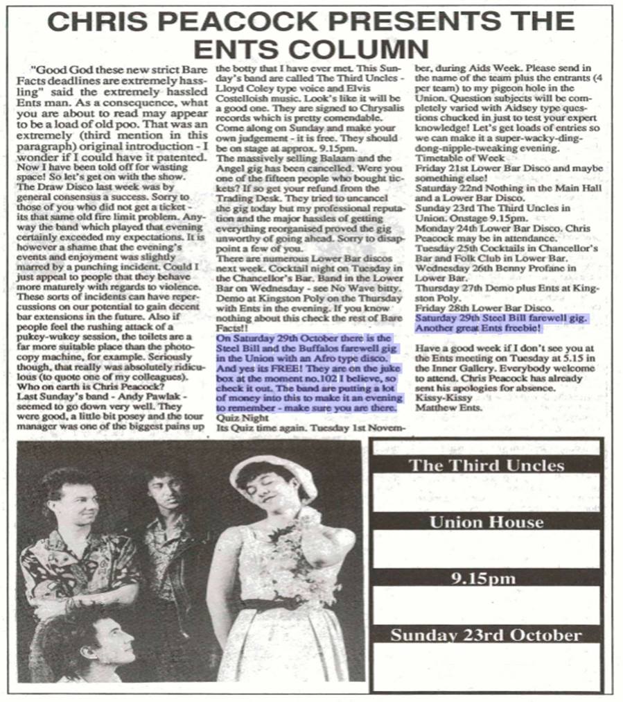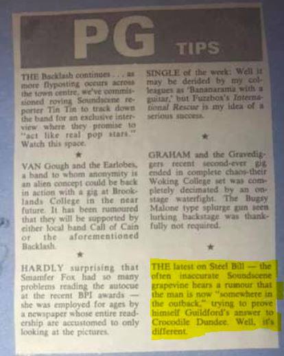 Their July ’88 gig at the University of Surrey Students Union (Dave Guerin did the sound) was hailed as the gig of the year. September that year saw them headline and win at “Showcase ’88” held at Centre Halls, Woking, and back at Surrey University later in October for their farewell gig. In Soundscene’s New Years Honors, a PG Tips tradition, three awards went to Steel Bill & the Buffalos: “Travel Scholarship Award” for Griffiths, “Memorial Award” (shared) and the “Golden Dentures Trophy”. The following year they picked up ‘The Andrew Lloyd Webber’ award in Soundscene’s Phil Gibby farewell honors.