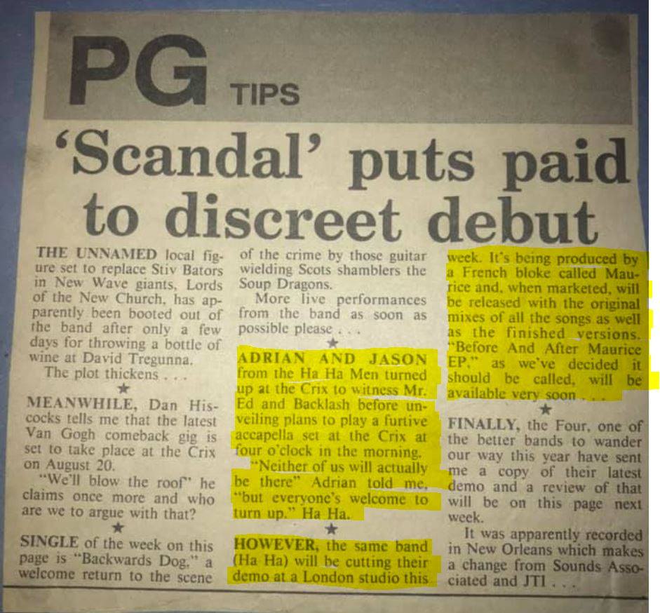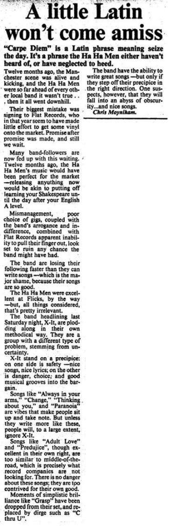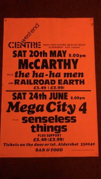 The bands first London gig was at a rather empty Rock Garden in Covent Garden (the booker was Jo Bartlet of Buzz Club fame), at which the Manic Street Preachers played first with Nicky Wire spitting at Bingley, and their drummer refusing to lend The Ha Ha Men his snare as it was too new. Other than London venues, the band were a regular feature at The Cricketers, Westfield and the West End Centre, Aldershot.