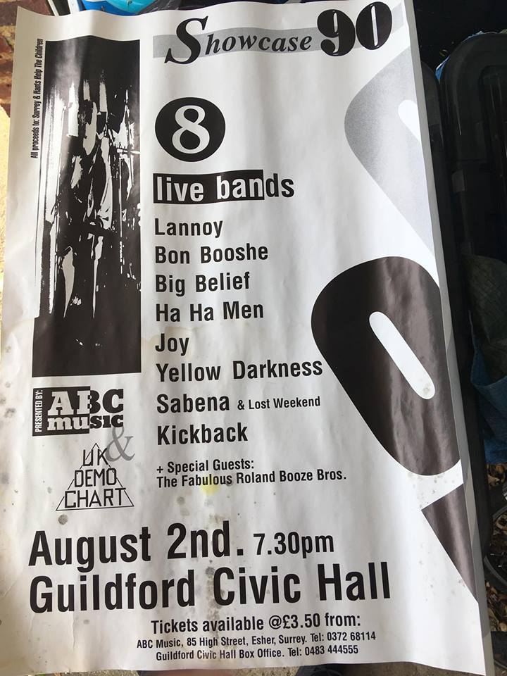 The band released a number of Cassette EP’s, notably ‘Face’ (This is what I knew it as, do let me know the official name) featuring “Like A Train”, “FishyHead”, “Falls Into My Lap” and “Crusin’ In My Terranova”; and the corduroy wrapped/covered “Power Cords”. Thatcher Youth PLC presented The Myriad Syndrone II on 14 July ’90 at the Borough Hall, Godalming with The Ha Ha Men headlining, supported by Yellow Darkness, Bushpigs, Octopussy and M.O.E. The next month, on 2 August ’90, the band appeared at Showcase ’90 held the Civic Hall, Guildford; sharing the stage with Yellow Darkness, Lannoy, Bon Booshe, Joy, Sabena, Lost Weekend, and Kickback. In October 1990 they supported Blur at the Buzz Club, West End Centre, Aldershot and based on the success of that event were invited to support again in November at the University of London.
