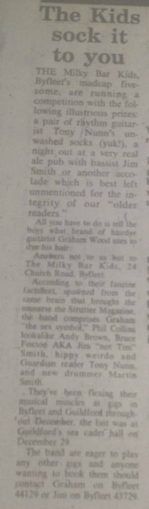 Soundscene, 20th September 1984Soundscene – July 28th 1988 – Reviewing two demos from The 68 Floods and their alter-egos, The Milky Bar Kids. Chris was struck by the amount of apathy he considered to be coming out of the speakers, but for Phil Gibby The 68 Floods have always given the impression of being smarter then the average local band.Soundscene – April,11th 1985Woking Soundscene – Jan 24th 1985Dirty Sock prizes from the Milky Bar Kids – January 3rd, 1985The Milky Bar Kids at at the Sea Cadet Hall, Guildford in 1984.The Milky Bar Kids at at the Sea Cadet Hall, Guildford in 1984.The Milky Bar Kids at at the Sea Cadet Hall, Guildford in 1984.The Milky Bar Kids at at the Sea Cadet Hall, Guildford in 1984.The Milky Bar Kids at at the Sea Cadet Hall, Guildford in 1984.The Milky Bar Kids at at the Sea Cadet Hall, Guildford in 1984.The Milky Bar Kids at at the Sea Cadet Hall, Guildford in 1984.The Milky Bar Kids at at the Sea Cadet Hall, Guildford in 1984.The Milky Bar Kids at at the Sea Cadet Hall, Guildford in 1984.The Milky Bar Kids at at the Sea Cadet Hall, Guildford in 1984.The Milky Bar Kids at at the Sea Cadet Hall, Guildford in 1984.The Milky Bar Kids at at the Sea Cadet Hall, Guildford in 1984.The Milky Bar Kids at at the Sea Cadet Hall, Guildford in 1984.The Milky Bar Kids at at the Sea Cadet Hall, Guildford in 1984.The Milky Bar Kids at at the Sea Cadet Hall, Guildford in 1984.The Milky Bar Kids at at the Sea Cadet Hall, Guildford in 1984.The Milky Bar Kids at at the Sea Cadet Hall, Guildford in 1984.