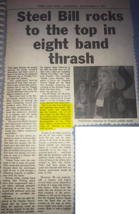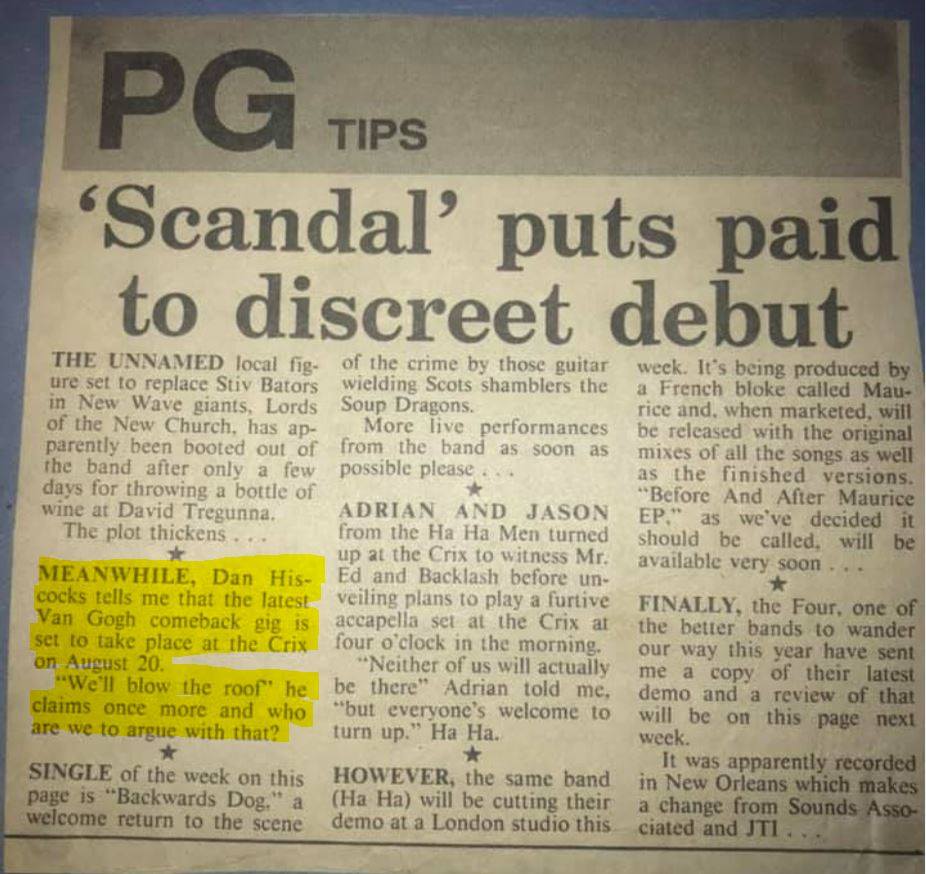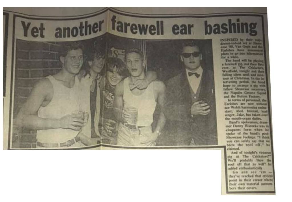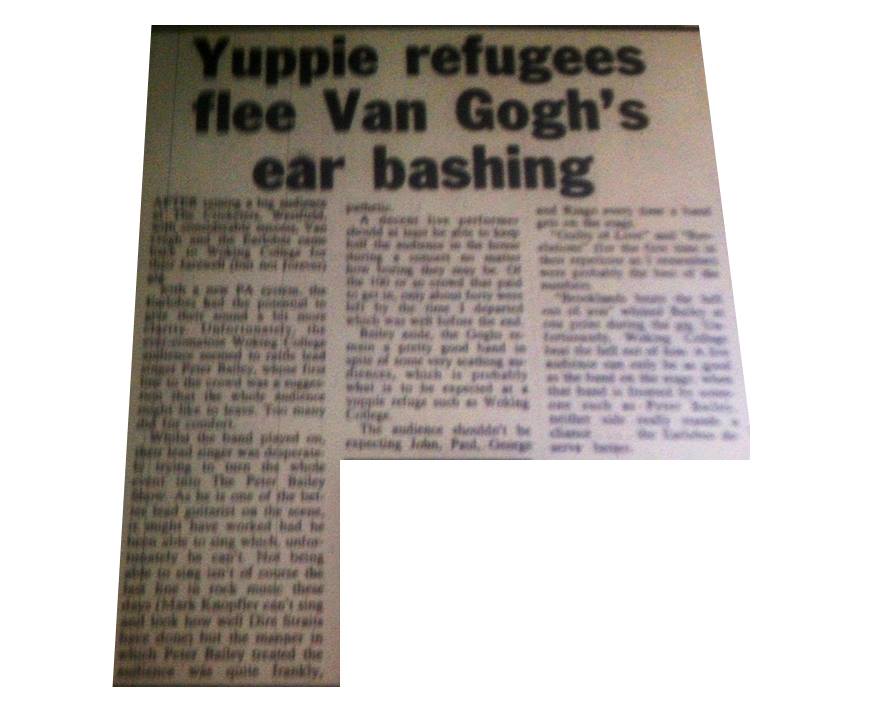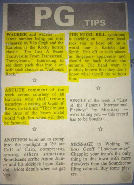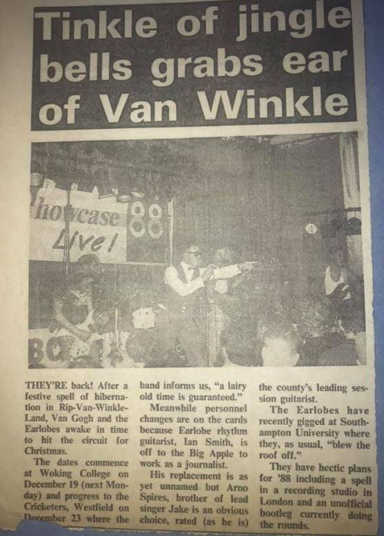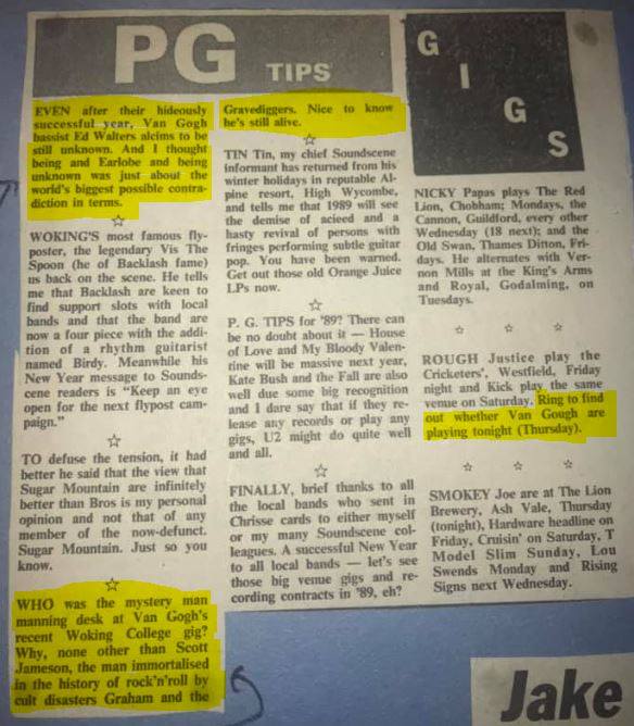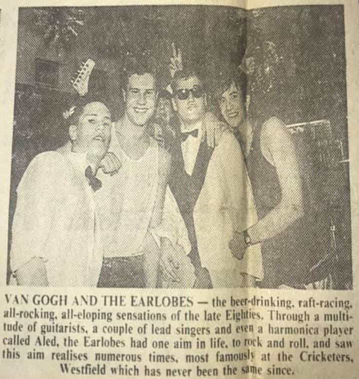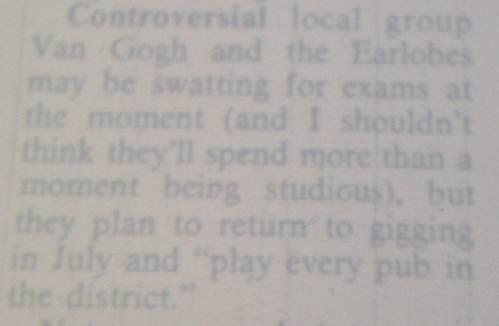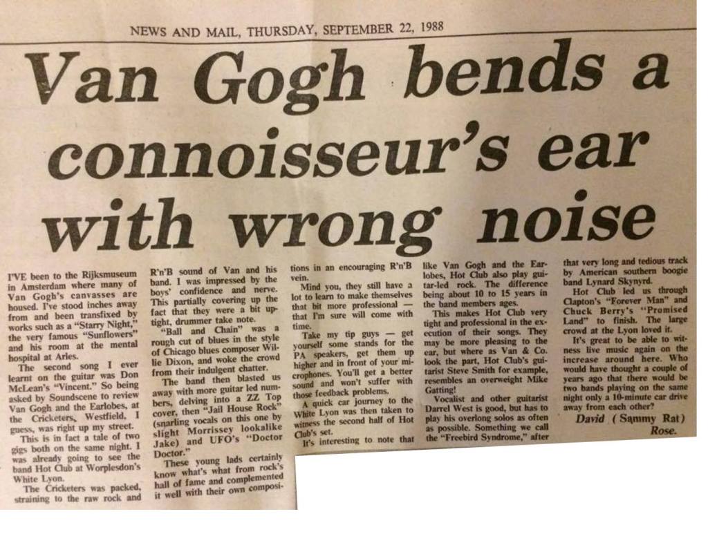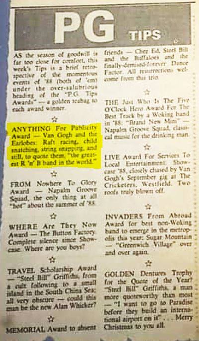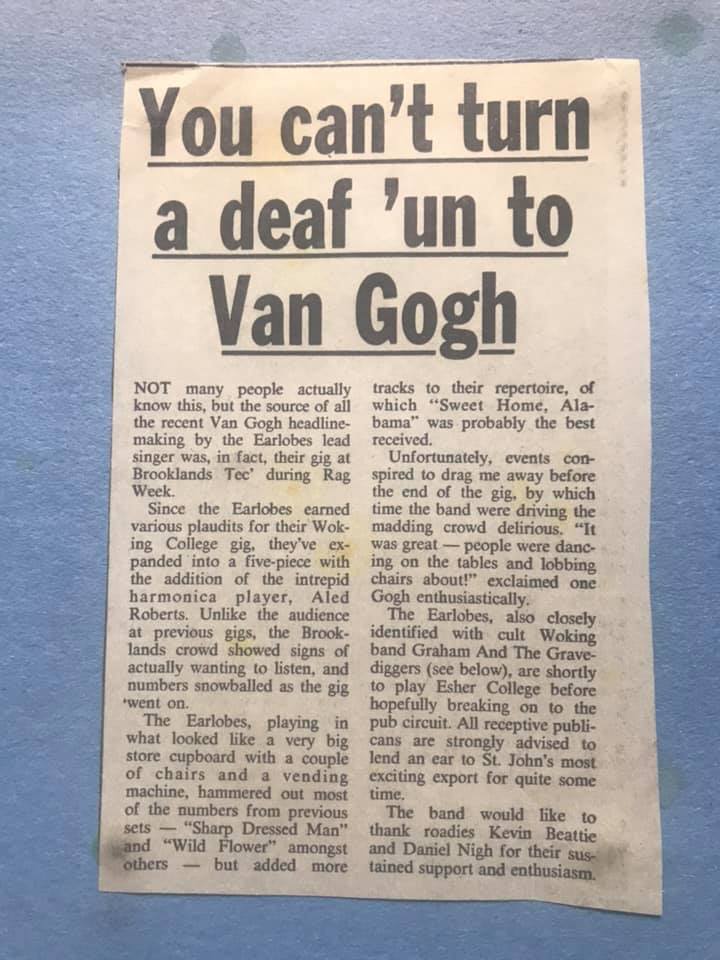 19 December 1988: Tickets for Van Gogh and the Earlobes’ lunchtime gig in the Main Hall, Woking College. Picture courtesy of Daniel HiscocksSoundscene’s Gigs Column, August 4th 1988July 28th, 1988 Soundscene sparks rumours of Body Politic reformation, and suggests Van Gogh… will be part of Woking Showcase gigA little mention of the Earlobes in this July 7th ’88 Soundscene piece by Phil GibbyPerpetual PG Tips material, Van Gogh appear again on May 26 1988A snippet from Soundscene’s PG Tips (as written by Phil Gibby) – May 19, 1988Soundscene, May 26th 1988 – really hard to read, and I thought twice about posting this, but lets take the good with the badSoundscene, April 21st 1988Taken from Soundscene’s PG Tips July 14th ’88PG Tips column from the August 4th 1988 Soundscene adds fuel to the fire that was the Button Factory / Van Gogh and The Earlobes rivalry…Pete Bailey gets an apology, kind of…. As taken from Soundscene’s PG Tips 18th August 1988.David Rose reviews Van Gogh and the Earlobes in 22 September ’88’s Soundscene. Picture courtesy of Vis The SpoonVan Gogh and the Earlobes playing at Centre Halls, Woking for Brooklands College party. The year is possibly ’88. Picture courtesy of Daniel HiscocksVan Gogh and the Earlobes playing at Centre Halls, Woking for Brooklands College party. The year is possibly ’88. Picture courtesy of Daniel HiscocksVan Gogh and the Earlobes playing at Centre Halls, Woking for Brooklands College party. The year is possibly ’88. Picture courtesy of Daniel HiscocksVan Gogh and the Earlobes playing at Centre Halls, Woking for Brooklands College party. The year is possibly ’88. Picture courtesy of Daniel HiscocksVan Gogh and the Earlobes playing at Centre Halls, Woking for Brooklands College party. The year is possibly ’88. Picture courtesy of Daniel HiscocksBB reviews Van Gogh… at Brooklands College gig held at Centre Halls, Woking. Date unknown, but we’d guess ’88. Picture courtesy of Daniel HiscocksFrom the 15 December ’88 Soundscene column, Phil Gibby profiles latest news on Van Gogh. Picture courtesy of Daniel HiscocksPhil Gibby mentions Van Gogh and the Earlobes twice in this PG Tips section, possibly from 22 Dec 1988 – a bad week for typos. Picture courtesy of Daniel HiscocksReview of Van Gogh and the Earlobes 23 December 1988 gig at The Cricketer’s, Westfield. Picture courtesy of Daniel HiscocksVan Gogh get a string of mentions in this undated PG Tips. Picture courtesy of Daniel HiscocksVan Gogh and the Earlobes get mentioned in PG Tips again (date unknown). Picture courtesy of Daniel HiscocksVan Gogh Article from Soundscene (date unknown). Picture courtesy of Daniel HiscocksVan Gogh win the “Anything for Publicity Award” in the PG Tips December 1988 honors list. Picture courtesy of Daniel HiscocksEarly ’89 and Paul Bushell confirms he has joined Van Gogh and the Earlobes (last paragraph). Picture courtesy of Daniel HiscocksSoundscene article from ’89 on the demise of Van Gogh an the Earlobes. Picture courtesy of Daniel HiscocksBackstage Pass for The Devil’s Dance Party, 23 March 1989, that included Van Gogh and the Earlobes. Picture courtesy of Daniel HiscocksReview of The Devil’s Dance Party from Soundscene (30 March ’89 column), that included Van Gogh and the Earlobes. Picture courtesy of Daniel HiscocksVan Gogh clipping from Soundscene, date unknown. Picture courtesy of Dan HiscocksVan Gogh reformation unlikely as Hiscocks goes backpacking. Soundscene clipping, date unknown. Picture courtesy of Daniel HiscocksVan Gogh annouce, another, Farewell gig at The Cricketers, Westfield following Showcase ’88…Soundscene clipping, date unknown. Picture courtesy of Dan HiscocksVan Gogh annouce “One Hundred Percent…” demo release. Soundscene clipping, 18 Jan 1990. Picture courtesy of Dan HiscocksVan Gogh and the Earlobes “…Through the Beers” cassette released. Soundscene clipping, date unknown. Picture courtesy of Daniel HiscocksVan Gogh and the Earlobes “…Through the Beers” cassette released. Soundscene clipping, date unknown. Picture courtesy of Daniel HiscocksClipping from 6 January 1990 Soundscence. Picture courtesy of Daniel HiscocksClipping from 21 December 1989 Soundscene. Picture courtesy of Daniel HiscocksVan Gogh in caricature. Picture courtesy of Daniel HiscocksPhil Gibby reviews Van Gogh’s first gig for Soundscene (date unknown). Picture courtesy of Daniel HiscocksPG Tips clipping from Aug 1989 puts next Van Gogh gig on Aug 20. Picture courtesy of Daniel HiscocksVan Gogh pick up the Sigue Sigue Sputnik award and share Most Momentus Occassion in the Phil Gibby farewell honors, August 1989. Picture courtesy of Daniel HiscocksVan Gogh and the Earlobes Soundscene column clipping (date unknown). Picture courtesy of Daniel HiscocksVan Gogh exceeded expectations at Showcase ’88, held at Centre Halls, Woking in Sept ’88. Picture courtesy of Daniel Hiscocks
