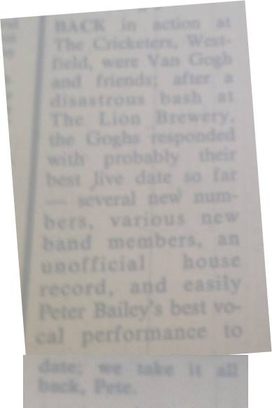 Van Gogh’s first gig, only 3 weeks after forming, was to a non-responsive crowd at Woking College. They were once touted for a warm-up slot on a prime-time TV show (which, I do not know) but were also well known for their exploits in the raft race held on Goldsworth Park Lake. Their biggest headline came when a schoolgirl ran off to Manchester with Bailey. Damian Wilson, of The Button Factory, is reported to have said of Van Gogh’s Bailey “he’s a better singer than myself”.