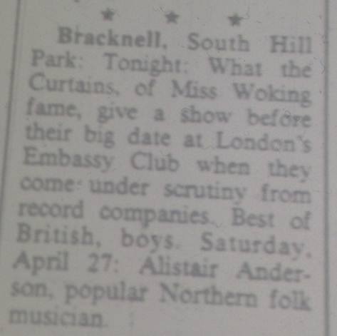 Named for a Prince Herbert line from ‘Monty Python and the Holy Grail’ their first single: “Crime or Passion”, backed by “Words (Can’t Tell)”, on the Rideaux Records label (WTC0042), was released in ’84 and received an acceptable review from Melody Maker while Soundscene reported it to be “a bit Wellerish”. In early ’85 Bagshot based What The Curtains committed their four best tracks to video (which Soundscene would love to find) at The Old Schoolhouse, Woking including “Acacia Child”. Later that year they played the Miss Woking Caberet, as well as at The Hippodrome and The Rock Garden. Reportedly the members of What The Curtains were extras in the movie Masters of the Universe after they had gone to Los Angeles to “make it” in the music business to no avail.