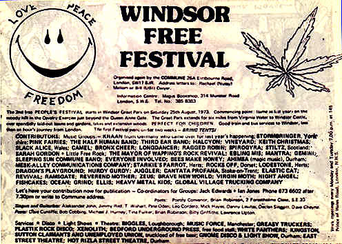 Windsor Free Festival, Windsor Great Park, Windsor: Windsor Free Festival, Windsor Great Park, Windsor: Pink Fairies, Fang, Camel, Nicky James, Coastroad Drive, Void, Shame Lady, Milton, Stiltz, Kraan, Ayup, Ebling Mis, Stormbringer, Gemini, Hawkwind, Raw Sienna, Global Village Trucking Co, Budgie, and Ahimsa