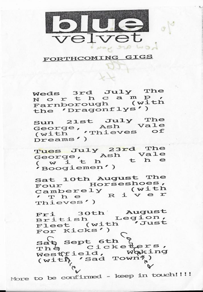 Blue Velvet at Rock Garden, London in July 1989. Picture courtesy of Pete ColeBlue Velvet at Rock Garden, London in July 1989. Picture courtesy of Pete ColeBlue Velvet at Rock Garden, London in July 1989. Picture courtesy of Pete ColeBlue Velvet at Rock Garden, London in July 1989. Picture courtesy of Pete ColeBlue Velvet at Rock Garden, London in July 1989. Picture courtesy of Pete ColeBlue Velvet at Rock Garden, London in July 1989. Picture courtesy of Pete ColeBlue Velvet at Rock Garden, London in July 1989. Picture courtesy of Pete ColeBlue Velvet at Rock Garden, London in July 1989. Picture courtesy of Pete ColeBlue Velvet at Rock Garden, London in July 1989. Picture courtesy of Pete ColeBlue Velvet at Rock Garden, London in July 1989. Picture courtesy of Pete ColeBlue Velvet at Rock Garden, London in July 1989. Picture courtesy of Pete ColeBlue Velvet at Rock Garden, London in July 1989. Picture courtesy of Pete ColeBlue Velvet at Rock Garden, London in July 1989. Picture courtesy of Pete ColeBlue Velvet at Rock Garden, London in July 1989. Picture courtesy of Pete ColeBlue Velvet at Rock Garden, London in July 1989. Picture courtesy of Pete ColeBlue Velvet at Rock Garden, London in July 1989. Picture courtesy of Pete ColeBlue Velvet supporting Neds Atomic Dustbin and Mega City Four at The West End Centre…1990 Image Source: Pete Cole26 Oct 1989: Blue Velvet supported Bow, with The Candyage at the Fresh Club, Bull and Gate, Kentish Town. Source: Mick Mercer via BULL & GATE MEMORIES – remembering all who sailed in her musical tidal waveThe Gossville Arsonist fanzine’s one-line review of Blue Velvet track from The Son of Farnborough Groove Vol.2Blue Velvet @ Four Horseshoes, Camberley 1991Soundscene gig review from sometime in/around 1990.Blue Velvet headline Pete Cole and Co’s birthday Bash in 1991.Taken from a 1990’s Soundscene column – not the FT. Image Credit: Pete ColeBlue Velvet @ The George, Ash Vale 1989Blue Velvet @ The George, Ash Vale 1989Blue Velvet @ The George, Ash Vale 1989Blue Velvet performing at The Bull & Gate, Kentish Town in 1989. Picture courtesy of Pete ColeBlue Velvet performing at The Bull & Gate, Kentish Town in 1989. Picture courtesy of Pete ColeBlue Velvet performing at The Bull & Gate, Kentish Town in 1989. Picture courtesy of Pete ColeBlue Velvet performing at The Bull & Gate, Kentish Town in 1989. Picture courtesy of Pete ColeBlue Velvet performing at The Bull & Gate, Kentish Town in 1989. Picture courtesy of Pete ColeBlue Velvet performing at The Bull & Gate, Kentish Town in 1989. Picture courtesy of Pete ColeBlue Velvet performing at The Bull & Gate, Kentish Town in 1989. Picture courtesy of Pete ColeBlue Velvet’s “Falling Star” appeared on the ‘Never Heard of ‘Em’ compilation cassette. Picture courtesy of Pete ColeBlue Velvet’s set list from the 21 July 1991 gig at The George, Ash Vale. Source: TOD Thieves of Dreams26 October 1990: Blue Velvet were at the Bull & Gate, Kentish Town. Picture courtesy of Pete Cole1991: Blue Velvet dates for July & August. Picture courtesy of Pete Cole1989 Buzz Club FlyerBlue Velvet’s “Gold That Shines” was track 2 on the A-side of Farnborough Groove Vol.1. Picture courtesy of Pete ColeBlue Velvet’s “On The Eve of Tomorrow” demo cassette sleeve. Source Sid StovoldBlue Velvet at the Bull & Gate c’89. Source Graham Judd (on left with blue Fender Telecaster)Side B: “Believe”Side A “On The Eve of Tomorrow”Two demo’s on one cassetteA Blue Velvet audience, at The George, Ash Vale 1989
