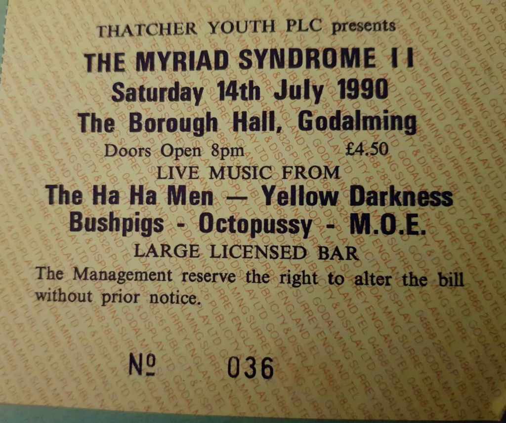 By January 1990 the band supported Tragic Roundabout and World of Music at the Opera on the Green, Shepherd’s Bush, on 2 January, and were headlining a Buzz Club local bands night, with DayTripper, Slug and TwoFlower. A few days later, on 15 January ’90, Yellow Darkness were at The Rock Garden, Covent Garden and then the Powerhaus, Islington on 6 February. On 7 July ’91 they released the limited edition “I Want to be the Drug” vinyl 12″ EP, carrying “Dolls House”, “Sugar Mountain”, and “She Wears Pyjamas on the Beach”. Thatcher Youth PLC presented The Myriad Syndrone II on 14 July ’90 at the Borough Hall, Godalming with The Ha Ha Men headlining, supported by Yellow Darkness, along with Bushpigs, Octopussy and M.O.E. They also appeared at Showcase ’90 and Parafornia ’91. ABC Music’s Showcase ’90 was held on 2 August ’90 at the Civic Hall, Guildford and Yellow Darkness shared the stage with The Ha Ha Men, Lannoy, Bon Booshe, Joy, Sabena, Lost Weekend, and Kickback. But, as far as we can tell, Yellow Darkness were the only band of the eight pressed into jumping onto the back of a flat bed lorry and playing as it was driven around Guildford to promote the charity gig for Surrey and Hants Help the Children Appeal.
