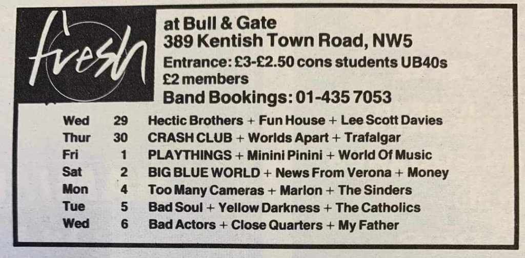 They were from Guildford, and played the London circuit: The Powerhaus, Bull & Gate (29 Oct ’91) Opera on the Green, The Cricketers, Kensington and The Rock Garden, plus support for Captain Sensible at The Mean Fiddler, Creaming Jesus at their Guildford gig and Smashing Orange on their visit to London.