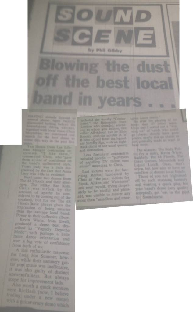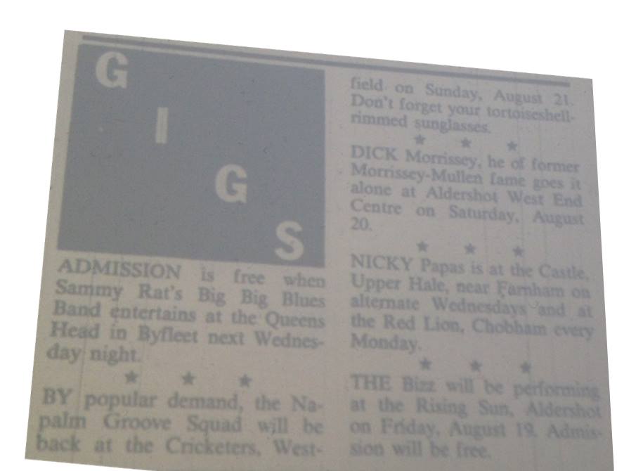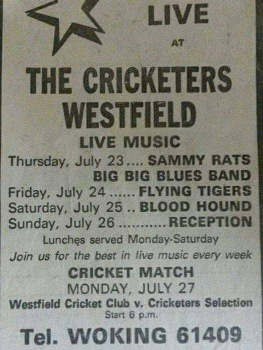 The band used to rehearse in the scout hut opposite The Queen Victoria, Shalford; popping into the pub where you could find Phil Collins from time to time. They’d been together and rehearsing for a while when they got their first gig, after which they were a regular feature on the local scene. The Cricketers, Westfield hosted in July ’86. In Oct ’87 they released the eight track “Juke Joint” cassette demo of R&B covers.