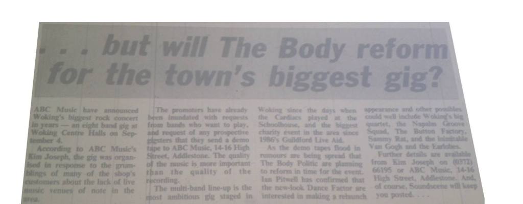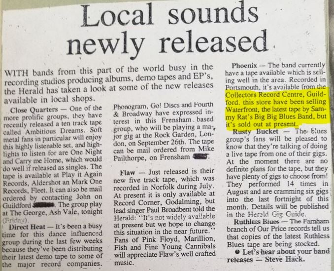 1990 was the beginning of a raft of changes, except The Rats regular sound man Graham ‘Chalks’ Collins, but also saw them supporting The Blues Band at the Civic. Larry ? (sax) joined, followed by a full brass section. George left to go to college and was replaced on bass by Bubs Reid. Reid disappeared and was replaced by Gareth Morgan. Rose left in 1990 and was replaced by, non-relative, Phil Rose. Several more line up changes followed and the band finally split in about the mid 1990s. The band’s “Waterfront” cassette LP was selling well from Collectors Records Centre, Guildford in late 1990.