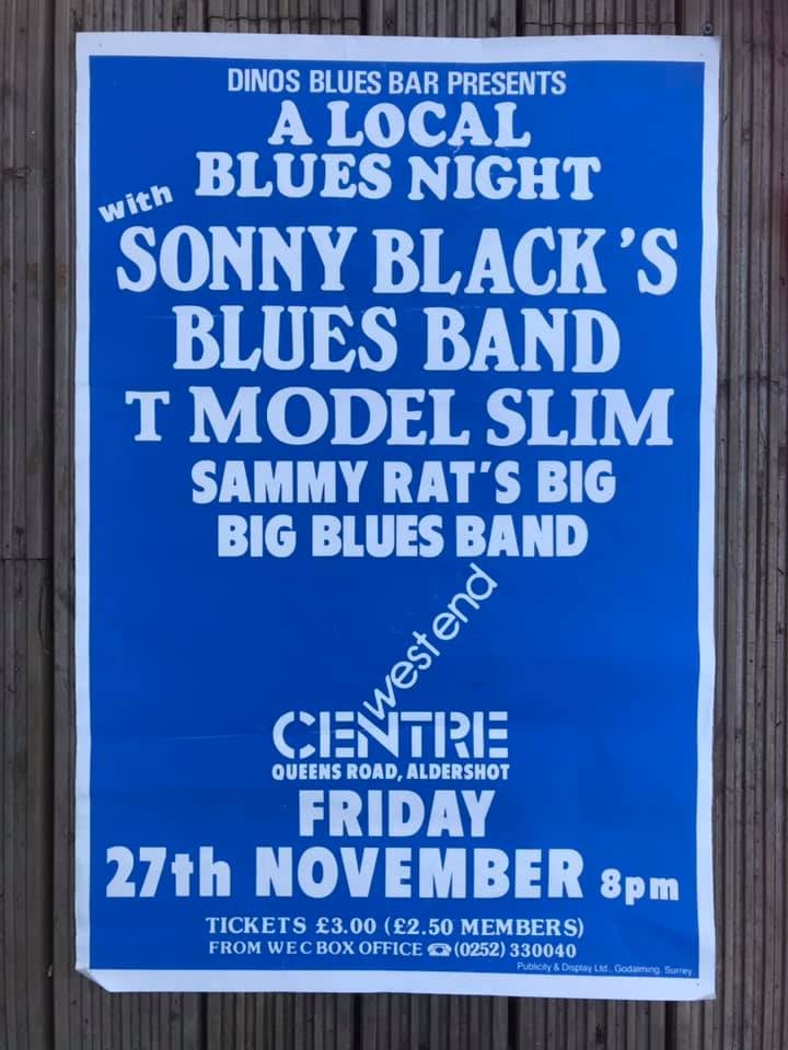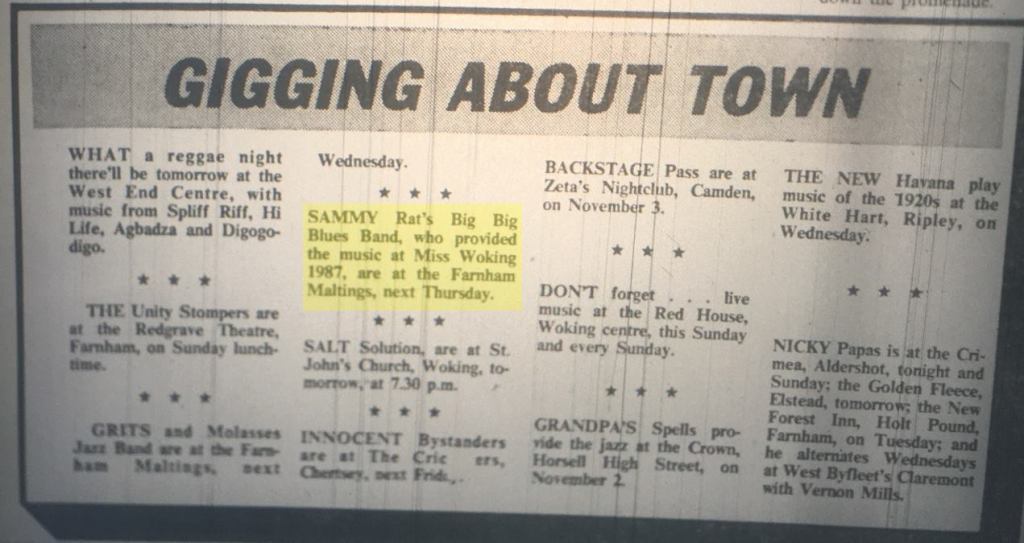 They performed at Miss Woking ’87 and at Farnham Maltings on 29th October ’87. The next month, with Sonny Black’s Blues Band and T Model Slim, they openned at the West End Centre. Aldershot. Then as part of their Christmas Tour, they appeared at Capstan’s on the 18 December ’87 and The White Lyon, Worplesdon on Christmas Eve, without the ‘Big Big Blues’. Early the next year because Rose knew Guildford Civic Hall Manager, Martin Dodd, they supported The Men They Couldn’t Hang on 25 March 1988. On 7 April ’88 the band played The Maltings once again, rolling up to the venue once more, five days later, on 13 April, to open for the Cuff Billet Jazz Band.