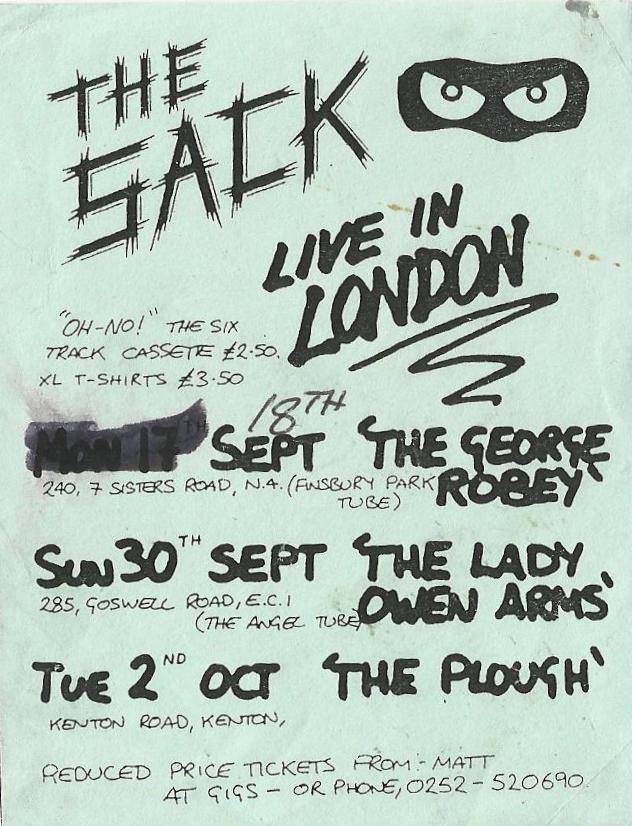 1 September 1990: Bubble-Eyed Dog Boys with Who Moved the Ground? and The Sack played Cove Labour Hall, Farnborough. Source: Who Moved The Ground?19901990199019901990. The Plough is now an Indo-Chinese fusion restaurant & bar and has been renamed Blue Ginger…In ’91, The Sack’s track “One Small Cut” was on Side 1, The Farnborough Groove Vol.1. Picture courtesy of Pete Cole.Side 1 of The Sack’s “Oh No!” cassette EP. Picture courtesy of Sid StovoldSide 1 of The Sack’s “Oh No!” cassette EP. Picture courtesy of Sid StovoldSide 2 of The Sack’s “Oh No!” cassette EP. Picture courtesy of Sid Stovold31 March 1990: Who Moved The Ground?, supported by Fear, The Sack, and Frantic, were at the West End Centre, Aldershot. Source: Who Moved The Ground?