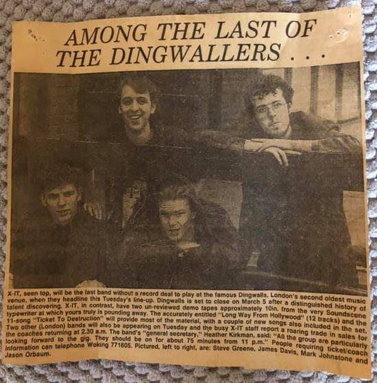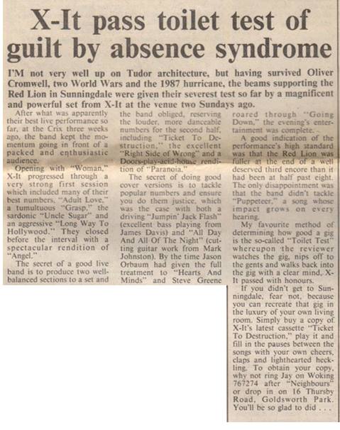 Clipping from Soundscene, February 21, 1991, posted earlier. Source: Corrina MeyerX-It get a mention in 1991 in review, from the 2nd Jan 1992 Soundscene column.Long haired Jim, the X-It manager, at Dingwalls, 26th February 1991. Picture courtesy of Harry Tuttle.26th February 1991, X-it headlined at Digwalls in Camden. Picture courtesy of Harry Tuttle26th February 1991, X-it headlined at Digwalls in Camden. Picture courtesy of Harry Tuttle26th February 1991, X-it headlined at Digwalls in Camden. Picture courtesy of HarryTuttle26th February 1991, X-it headlined at Digwalls in Camden. Picture courtesy of Harry Tuttle26th February 1991, X-it headlined at Digwalls in Camden. Picture courtesy of Harry TuttleClipping from Soundscene, February 21st, 1991. Picture courtesy of Harry TuttlePicture courtesy of Harry TuttlePicture courtesy of Harry Tutt;ePicture courtesy of Harry TuttlePicture courtesy of Harry TuttleX-It at The Cricketers, Westfield in December 1990. Picture courtesy of Harry Tuttle.X-It at The Cricketers, Westfield in December 1990. Picture courtesy of Harry Tuttle.X-It at The Cricketers, Westfield in December 1990. Picture courtesy of Harry Tuttle.X-It at The Cricketers, Westfield in December 1990. Picture courtesy of Harry Tuttle.X-It (or maybe they were still called Dark then) at The Cricketers, Westfield in April 1990. Picture courtesy of Harry TuttleX-It (or maybe they were still called Dark then) at The Cricketers, Westfield in April 1990. Picture courtesy of Harry Tuttle.Gig flyer from 1991 – Picture courtesy of Harry Tuttle1991. Picture courtesy of Harry TuttlePicture courtesy of Harry TuttlePicture courtesy of Harry TuttleIt’s X-It. Picture courtesy of Harry TuttleOrbaum’s vocal’s for X-It were compared favorably to Elvis Costello. Picture courtesy of Harry TuttleX-It’s Orbaum in the groove. Picture courtesy of Harry TuttleX-It bassist Davis with backing vocalists. Picture courtesy of Harry TuttleSoundscene – 23rd July 1991. Picture courtesy of Harry TuttleSoundscene – 11th April 1991. Picture courtesy of Harry TuttleTwo articles on X-It in the January 9th 1992 Soundscene column. Picture courtesy of Harry Tuttle7 Dec 1991:1A busy night at The Cricketers Westfield. Picture courtesy of Harry TuttlePromotional poster for X-It’s “Are We Having Fun Yet?” Demo. Note: Under the name X-it it says “Shed III”, it was the third release of Two Sheds Records Productions. A reference to Monty Python. And of course produced by the legendary Porty Bruford. ..Picture courtesy of Harry TuttleX-It’s “Right Side Of Wrong” was 3rd and “Prejudice” was 9th in Soundscene’s Top 10 local songs of 1990. Clipped from 3 Jan ’91 Soundscene column. Picture courtesy of Daniel Hiscocks