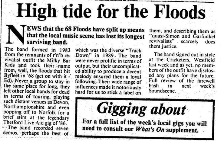 The Milky Bar Kids became the Byfleet based The 68 Floods, following a cease and desist letter from Nestle’s legal department, in early ’85. Named after the Byfleet/Woking/Guildford floods of ’68 they recorded seven demos, including 1989’s ‘Track Down’. They gigged all over the UK from Devon to Northamptonshire, including appearances at Thetford Live Aid ’87 and the 16th Greenbelt at Castle Ashby in August ’89.