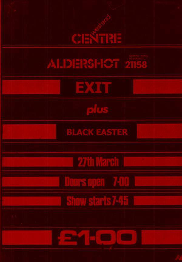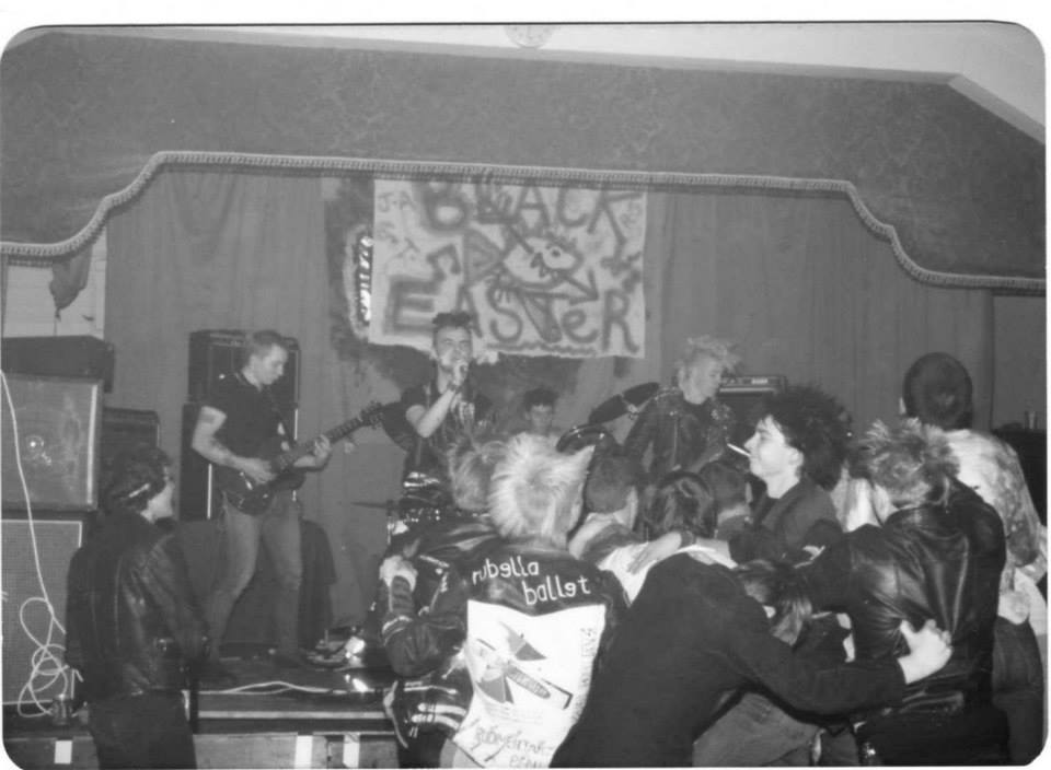 ’82 was closed out at Farnborough Tech, on 17 December, with Black Easter headlining. On 28 January ’83, Black Easter supported The Normals, with Capricorn, Cry Havoc and Les Strawberries at Basingstoke Technical College. Whether or not Liz Hurley had anything to do with the band’s booking by Basingstoke Technical College Student Union we have yet to confirm. In May ’83 Black Easter supported Clone, along with Maxi Puch & The Macho Moped Men at 5’s Wine Bar, Aldershot. A few month later, in July/August Sime was replaced on bass by Paul Pomeroy. Burt then left the band and joined the army in late ’83; he was replaced on vocals by Farnborough and former Oak Farm boy Jem Hammick whose first gig with Black Easter was January ’84. The following month Black Easter were at the Old School House, Woking for a punk night that included The Contaminated and The Plague, and at Caird Hall. At a 14 March ’84 gig at the Country Club, Fleet; supporting Little Skeletons, the band played one song before having the power turned off.
