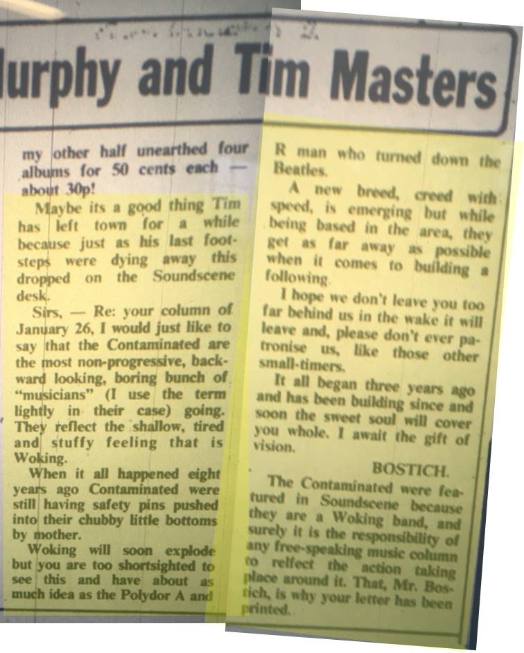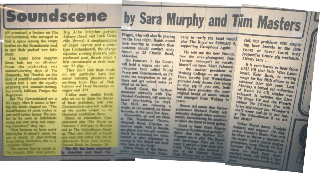 Horsell based punk band The Contaminated were form in 1982. They rehearsed in Horsell and at the Youth Club on Walton Road, Woking; playing around 100 gigs in and around Woking and Guildford and up into London. In the early 80’s, The Plague organized ‘The Sty’ rock / punk club nights the West End Centre, Aldershot and The Contaminated were one of the bands booked. During there run Keating was replaced by Paul (Oggie / Og) ? and Jonny Bowden joined to replace Parrish. They cited their influences as being from Flux of Pink Indians to Dead Kennedy’s to reggae and heavy metal.