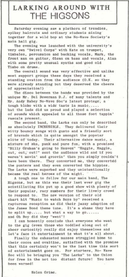 26 January 1986: Swivel Corp and The Larks opened up for The Higsons Source: Jonny Mendelsson via The LARKS