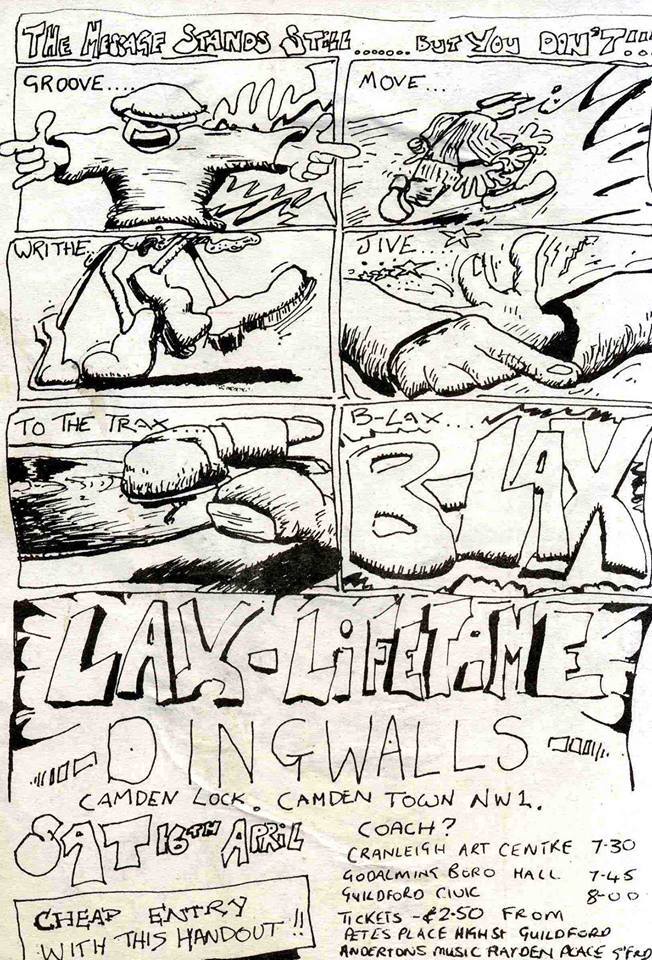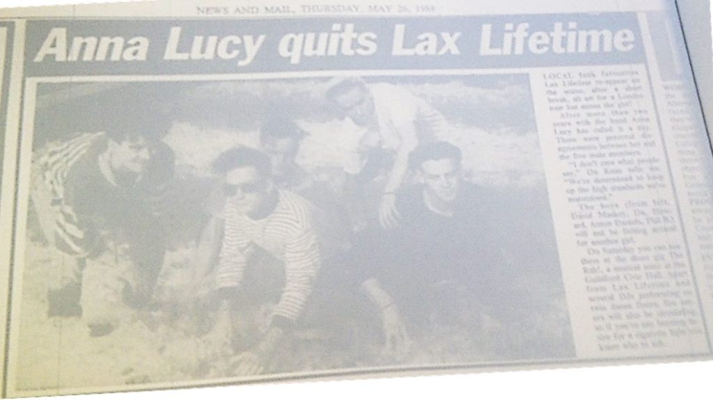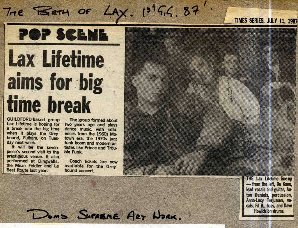 In December ’87 they were in the the Ha! Bloody Ha! studio to lay down “Sand Through Glass” again with Scampi. This was then added to the “Beat! The Elite…” demo cassette reissue, with production credits for Chambers and Fairfax. Kane was also responsible for ‘persuading’ The Rak to put on an event at Guildford Civic, at which Lax Lifetime headlined. The Rak and it’s promotor and organizer, Lance Lush, were totally fictional, with Lush purportedly organizing raves on trains from Waterloo and boats on the Thames. Torjussen left the funk band in early ’88 with the band winding up late that year.