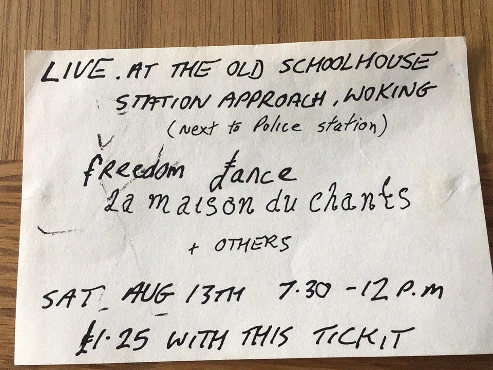 Freedom Dance played the May Bug Ball at University of Surrey on 7 May 1983, along with Creatures of Darkness, LongPig, and La Maison Du Chants. La Maison Du Chants and Freedom Dance often shared the stage and were back together on 13 August 1983, along with Rainbow Road at the Old School House, Woking. They were also at The Old Schoolhouse, in Mid ’83, sharing the stage with Plan A, La Maison Du Chants, and Pied Piper & The Rats.