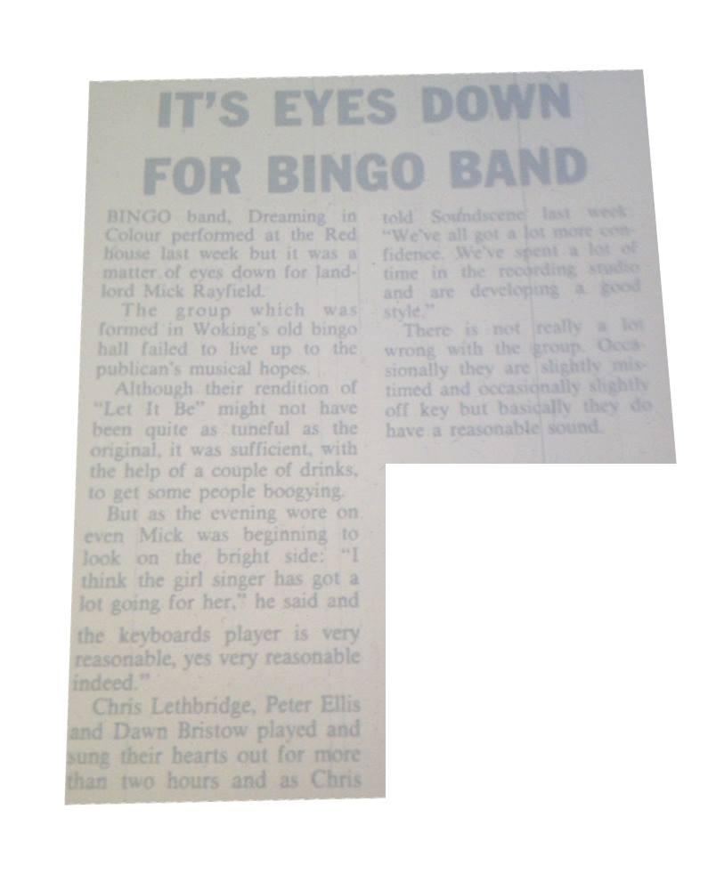 The Lethbridge, Ellis and Bristow formed Dreaming in Colour in Woking’s old, and shortly after demolished, bingo hall. But, while picked to support Fat and Frantic at the Guildford Civic Hall (22 April ’88) and at Manchester University (28 April ’88), Dreaming In Colour were not always well received on the Woking circuit.