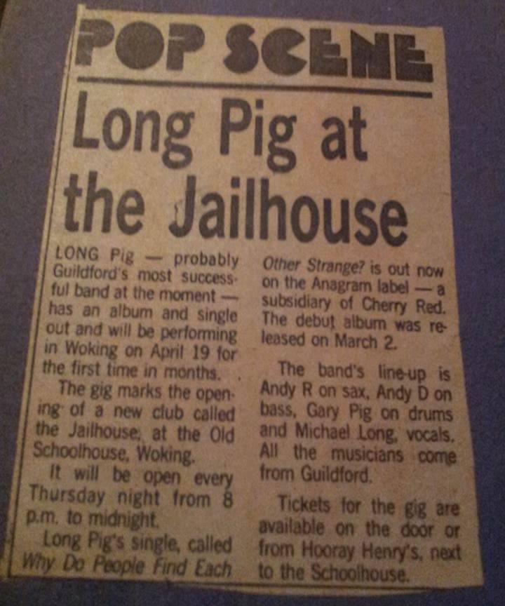Guildford born LongPig (often listed as Long Pig) gigged extensively in the Woking and Guildford area, including nights at the University of Surrey, and notably opening The Old Schoolhouse’s “The Jailhouse” club night. The band ventured further afield to the likes of The Batcave, at Heaven, London. James “Coco” Essua, a bouncer at Bunters, Guildford, would sometimes join them on stage playing the bongos.