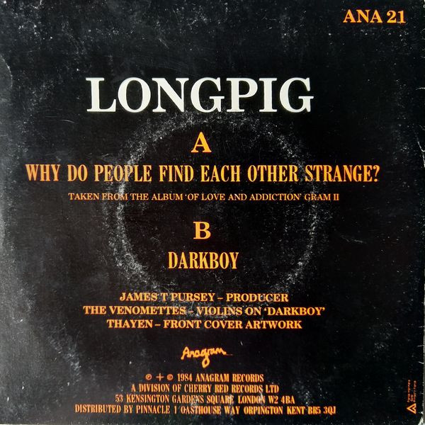 On 2 March ’84 they released the James T. Pursey – aka Jimmy Pursey, the Sham 69 frontman – produced nine track vinyl LP “Of Love and Addiction” on Anagram Record [GRAM 11] which featured the Venomettes on “Batsong” playing violin. This same year saw the single “Why Do People Find Each Other Strange?” backed by “Darkboy” hit the shelves. This was also on the Anagram label and could be found in 7″ (ANA 21) and 12″ (12 ANA 21) versions. On the 19 April ’84, Longpig performed at the opening of the Jailhouse Club, held at The Old Schoolhouse, Woking. Exactly a year after the May Bug Ball, on 7 May 1984, the band headlined the bill for a University of Surrey New Wave Society event supported by La Maison Du Chants, Freedom Dance, Funtime for Phillip and Dark Trio. This event got the band featured in The Werewolf fanzine. They were back at the University of Surrey for the June Jitterbug with Dark Paradise, D Fabulous, No Joy, Betrayed, and Asylum Sounds on 9 June ’84.