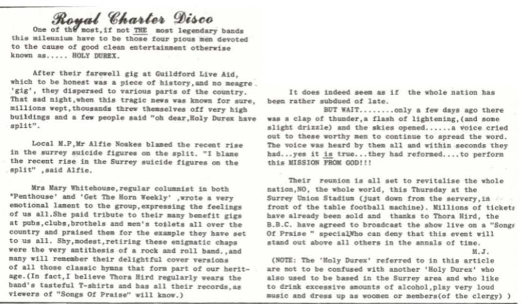 This University of Surrey, Guildford based four-piece often performed dressed as clergy and on at least one occasion roped in Casual Sax, thanks to Robb of Steel Bill and The Buffalos, for whom the sax’y trio also provided horn. In May ’85, Holy Durex entered the University of Surrey Student Band Competition along with Fantasy Lies, but lost out to Swivel Corps, before the evening was headlined by the Geisha Girls. They went on to appear at the University’s Blues All-Dayer and they headlined the University of Surrey Rugby Club’s Drag Disco on 31 January ’86. Later that year they performed at the University’s Royal Charter Disco, supporting Bad Manners along with Inspector Tuppence & the Sexy Firemen; with the event starting at 8:00pm and ending at 6:30 the following morning. Their farewell gig was Guildford Live Aid at the Civic Hall, Guildford, but this was followed by a reunion gig at the University, involving the four mail members, on 3 July ’86.