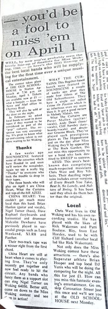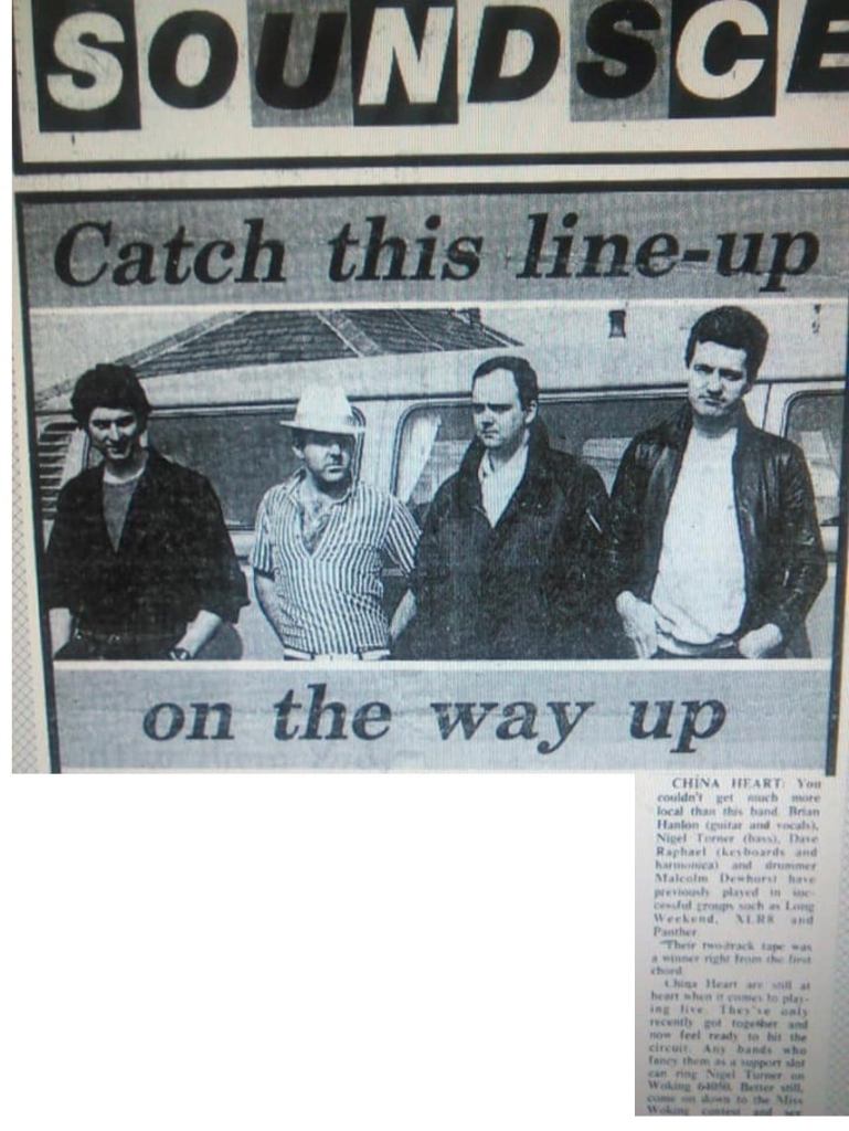 The four formed China Heart in early ’85, having previously played in bands such as XLR8, Long Weekend and Panther. They were one of three bands, with AZIZI and What The Curtains, that played the Miss Woking Caberet in ’85; having impressed with their two track demo cassette carrying “Just Seen a Face”, and “Lovers & Fools”.