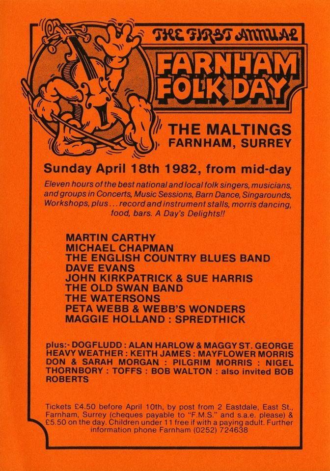 The Maltings, Farnham: The 1st Farnham Folk Day – Martin Carthy w/ Michael Chapman, The English Country Blues Band, Dave Evans, John Kirkpatrick & Sue Harris, The Old Swan Band, The Watersons, Peta Webb & Webb’s Wonders, Maggie Holland, Spredthick, Dogfludd, Alan Harlow & Maggie St. George, Heavy Weather, Keith James, Don & Sarah Morgan, Nigel Thornbory, Toffs, and Bob Walton