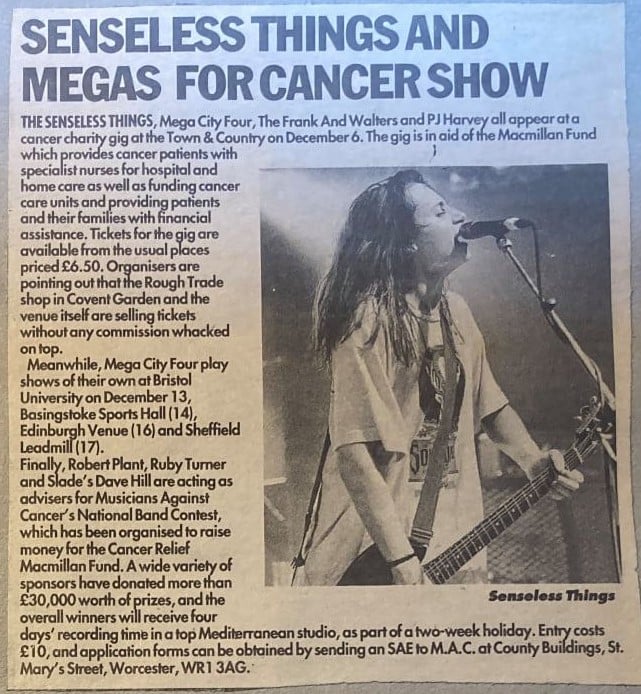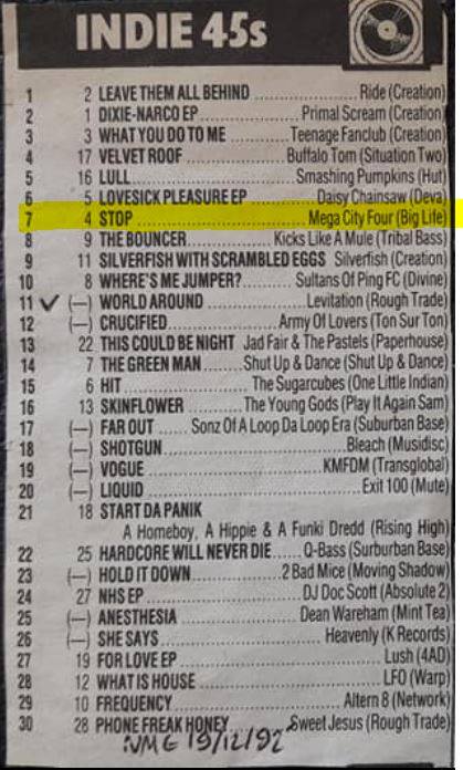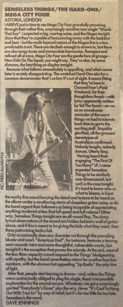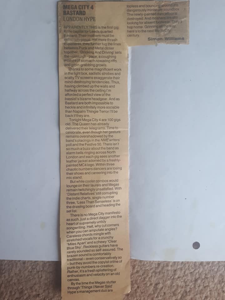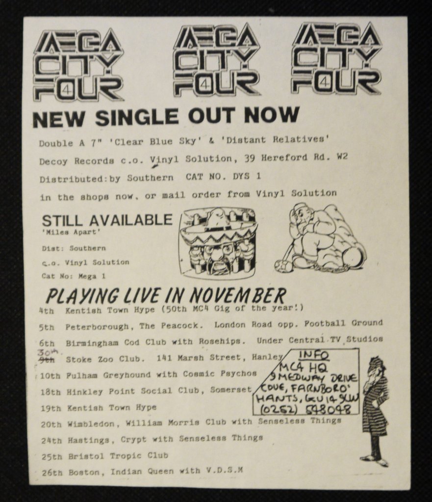 20 May 1990: The Leadmill, Sheffield: Mega City Four w/ The Bollweevils, and The Things3 May 1989: Mega City Four at Notional Ballroom, Kilburn.17 August 1988: Mega City Four played at The Sir George Robey, with Senseless Things, Perfect Daze, Sperm Wails, and Reach. Source: Tom A Deakin via Mega City FourNME, 19 December 1992: Mega City Four’s “Stop” sits at No.7 in the Indie Single Chart. Source: Lethielleux Here via Tom PughNME, 11 March 1992: Mega City Four’s “Sebastopol Rd” sits at No.2 in the Indie LP Chart. Source: Lethielleux Here via Tom Pugh2 Feb 1989: Mega City Four, supported by Senseless Things and SNUFF, were at The Greyhound, London. Source: Paul White via Mega City FourMega City Four made it to No.4 on Pete Cole’s Melody Maker Reader’s Chart c’95. Picture courtesy of Pete ColeThe cover of the Spanish fanzine Brain Dead No.1 which featured Mega City Four.The cover of the fanzine Disposable But Happy No.1 which featured Mega City Four. Picture courtesy of Paul White via Mega City FourApril 21st 1989 and MC4 are up The Bull & Gate. Picture courtesy of Mick Mercer and the BULL & GATE MEMORIES – remembering all who sailed in her musical tidal wave.April 21st 1989 and MC4 are up The Bull & Gate. Picture courtesy of Mick Mercer and the BULL & GATE MEMORIES – remembering all who sailed in her musical tidal wave.April 21st 1989 and MC4 are up The Bull & Gate. Picture courtesy of Mick Mercer and the BULL & GATE MEMORIES – remembering all who sailed in her musical tidal wave.April 21st 1989 and MC4 are up The Bull & Gate. Picture courtesy of Mick Mercer and the BULL & GATE MEMORIES – remembering all who sailed in her musical tidal wave.April 21st 1989 and MC4 are up The Bull & Gate. Picture courtesy of Mick Mercer and the BULL & GATE MEMORIES – remembering all who sailed in her musical tidal wave.April 21st 1989 and MC4 are up The Bull & Gate. Picture courtesy of Mick Mercer and the BULL & GATE MEMORIES – remembering all who sailed in her musical tidal wave.April 21st 1989 and MC4 are up The Bull & Gate. Picture courtesy of Mick Mercer and the BULL & GATE MEMORIES – remembering all who sailed in her musical tidal wave.April 21st 1989 and MC4 are up The Bull & Gate. Picture courtesy of Mick Mercer and the BULL & GATE MEMORIES – remembering all who sailed in her musical tidal wave.April 21st 1989 and MC4 are up The Bull & Gate. Picture courtesy of Mick Mercer and the BULL & GATE MEMORIES – remembering all who sailed in her musical tidal wave.8 April 1988: Mega City Four are at The Bull and Gate, Kentish Town. Source: Mick Mercer via BULL & GATE MEMORIES – remembering all who sailed in her musical tidal wave8 April 1988: Mega City Four are at The Bull and Gate, Kentish Town. Source: Mick Mercer via BULL & GATE MEMORIES – remembering all who sailed in her musical tidal wave8 April 1988: Mega City Four are at The Bull and Gate, Kentish Town. Source: Mick Mercer via BULL & GATE MEMORIES – remembering all who sailed in her musical tidal wave8 April 1988: Mega City Four are at The Bull and Gate, Kentish Town. Source: Mick Mercer via BULL & GATE MEMORIES – remembering all who sailed in her musical tidal wave8 April 1988: Mega City Four are at The Bull and Gate, Kentish Town. Source: Mick Mercer via BULL & GATE MEMORIES – remembering all who sailed in her musical tidal wave8 April 1988: Mega City Four are at The Bull and Gate, Kentish Town. Source: Mick Mercer via BULL & GATE MEMORIES – remembering all who sailed in her musical tidal wave1 May 1988: T-shirt from night Mega City Four supported Brian along with Bladder Bladder Bladder, Repo-men, Fat Babies and The Ryecatchers at Dingwalls. Source: Nicholas Evans via BULL & GATE MEMORIES – remembering all who sailed in her musical tidal wave1 May 1988: Mega City Four at Dingwalls, supporting Brian along with Bladder Bladder Bladder, Repo-men, Fat Babies and The Ryecatchers. Source: Christy Lawrance via BULL & GATE MEMORIES – remembering all who sailed in her musical tidal wave1 May 1988: Mega City Four at Dingwalls, supporting Brian along with Bladder Bladder Bladder, Repo-men, Fat Babies and The Ryecatchers. Source: Christy Lawrance via BULL & GATE MEMORIES – remembering all who sailed in her musical tidal wave24 December 1988 and 4 January 1989: Mega City Four were at the Sir George Robey, London for Paul Ronan Revue Bar events. On Christmas Eve they headlined with Snuff, Shout, Thrilled Skinny, Savage Opera, The Guttersnipes and Jellyfish Kiss. On 4 Jan they headlined again with the Milk Monitors, Sister Midnight, and Kiev Exocet in support.A wealth of Mega City Four bootlegs and demos, helping us confirm some gig dates. Source: Lloyd Chambers via Mega City Four26 March 1992: The University of Ulster Student Union hosted Mega City Four and Midway Still in their Conor Hall, Belfast. Source: Neil Trelford via Mega City Four15 September 1989: Mega City Four, supported by The Cateran and Sink, played The Marquee. Source: Kevin Powell via Mega City FourMega City Four featured on the cover of the German Sunset fanzine Nr.4. Source: Georg Klumpp via Mega City Four12 May 1988: Mega City Four, along with West Won and Doodaa Tzars, supported Weddings, Parties, Anything at the Mean Fiddler, Harrlesdon. Advert from NME, 7 May 1988. Picture courtesy of Pete Cole26 September 1989: Exeter’s Timepiece hosted Mega City Four, with Fish Tank in support. Source: Paul Gray via Mega City FourThe Mega City Four’s “Pride & Prejudice” is the first track on Side Two of the ‘Out Of The Blue’ cassette fanzine.The Mega City Four’s track “Pride & Prejudice” is on the ‘Out Of The Blue’ cassette fanzine.The Mega City Four page of the booklet that accompanied the ‘Out Of The Blue’ cassette fanzine outline what their track “Pride & Prejudice” is about.The Mega City Four’s track “Pride & Prejudice” is on the ‘Out Of The Blue’ cassette fanzine.3 June 1993: Mega City Four were at The As