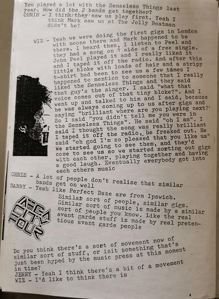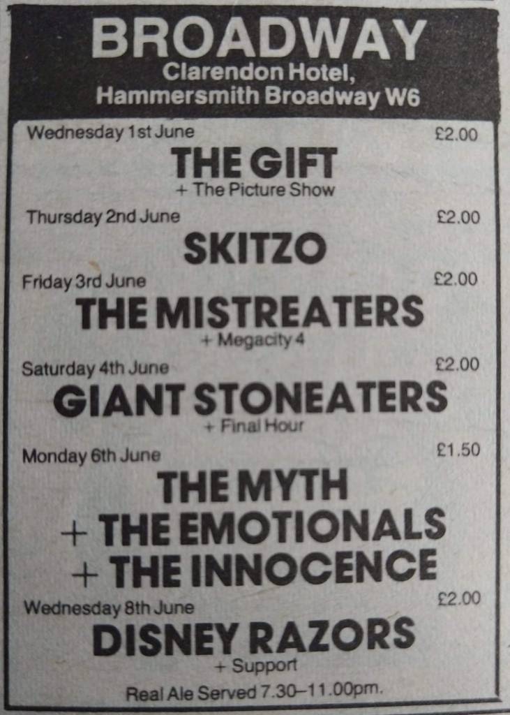Late ’88 saw the band’s “Alternative Arrangement” included in the “A Taste of…” compilation cassette, compiled by Basingstoke fanzine “Fraudian Black” creator Cal Graham. In November ’88 the band released their second single, the double-A sided “Clear Blue Sky / Distant Relatives” on Decoy. Produced and engineered by ex-Procol Harum keyboardist, Matthew Fisher, at his Old Barn Studios, near Croydon, it was NME’s ‘Single of the Week’ and described as ‘A classic seven inch single” and “blistering”. How’d they celebrate the singles release? With their 50th gig of the year since 1 January. On 17 December, a month when the band were still pushing the debut single hard, they played Oxford’s Nightclub, London supported by The Satelites. A few days later, on Christamas Eve, the band headlined Paul Ronan Revue Bar night, at the Sire George Robey, London with Savage Opera, Snuff, Shout, Thrilled Skinny, The Guttersnipes, and Jellyfish Kiss in support. Wiz got sacked from his day job just before Christmas that year, with the rest of the band quitting by January ’89, including the three roadies.