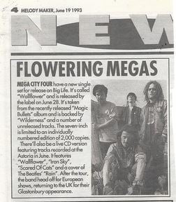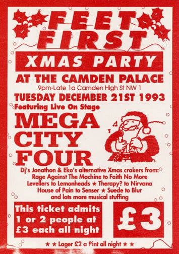 Big Life Records, which had been formed by Jazz Summers, who’d previously been involved with Wham!, and Blue Zoo guitarist Tim Parry, put out their second MC4 studio album, titled “Magic Bullets”, in ’93. MC4 were at The Astoria, London on 3 June ’93 – a gig that was recorded for future release – with the single “Wildflower”, taken from the recently released “Magic Bullets”, released on 28 June. The 7″ was a limited release of 2,000 copies and carried “Wilderness” and a number of unreleased tracks on the flip-side. The aforementioned Astoria gig recordings were released as a ‘live’ CD and included “Wallflower” along with “Iron Sky” and “Afraid of Cats”. After a quick release tour and a trip to European venues the band return for Glastonbury. On 19 September the band were back with Peel, recording another session. A support slot for Rosa Mota followed a few days later a The Garage, London on 25 September. The following month, on 4 October, Strange Fruit issued “Mega City Four – Peel Sessions” [SFRCD124] a promo cassette of their 1988 Peel session. The Feet First Christmas Party was held on 21 December ’93 at The Camden Palace at which MC4 were the live band.
