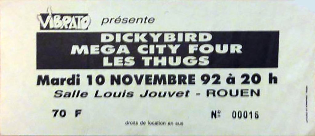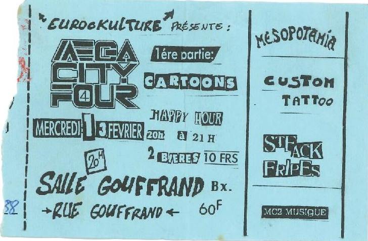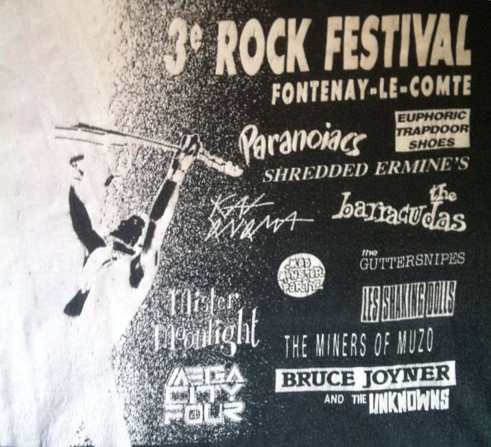 The band were in France again to play the 3rd Fontenay-Le-Comte Rock Festival, appearing with Real Cool Killers, Miners of Muzo and Bruce Joyner on 28 October ’90. The band stayed in France performing for more nights, consecutively, at L’Arceau, Angers (29 Oct); Ker Opus Bar, Langolen (30 Oct) performing to around 160 French fans; Espace Ornano, Paris (31 Oct); and Le Sax, Acheres (1 Nov).