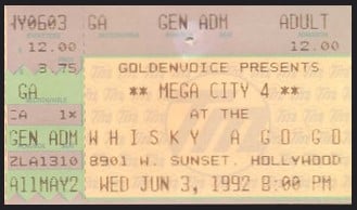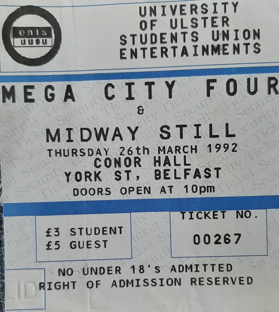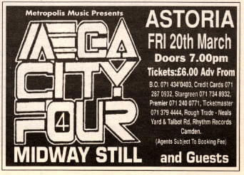 The Technical College, Farnborough hosted a local band night on 15 February ’92 which MC4 headlined supported by Phobia, Pretty Green and Big Boy Tomato. In early ’92 MC4 toured with Midway Still. On 28 February, MC4 supported by Midway Still, played the Woughton Centre – aka “The Pitz” – Milton Keynes. The next month the Astoria, London hosted the bands on 20 March ’92 and five days later the pair were at McGonagles, Dublin, traveling north and across the border to appear at The University of Ulster the next day. Two months later the MC4 undertook the ir first and only North American tour, from 20 May to 3 June supporting the US release of “Sebastopol Rd”. This included Les Foufounes Électriques, Montreal, QC (May 27); Slim’s, San Francisco, CA (June 2); and finally Whisky A Go Go, West Hollywood, CA (June 3), supported by The Black Watch. Shortly after returning to the UK the band, along with The Cult, Ned’s Atomic Dustbin, Pearl Jam, Nitzer Ebb, Mercury Rev, L7 and Therapy? were on the main stage at In The Park ’92, Finsbury Park, London on 6 June.