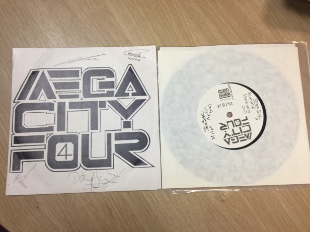Tim Naylor’s signed copy of Mega City Four’s debut single “Miles Apart / Running In Darkness”; of which 1000 copies were pressed in 1988 on the Primitive label.