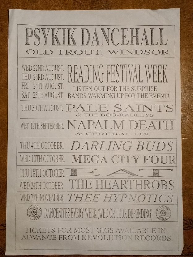 On 8 April ’94 the band were once again at Hype, Bull & Gate and on 26 May they played The Old Trout, Windsor supported by Euphoria.. ‘Scene’ cohorts Senseless Things were booked to headline the Abbey Park Festival, Leicester on 13 August ’94, but a guitarist’s broken arm saw them pull out to be replaced by Mega City Four. Jumping to ’95, Wiz filled in for guitarist Gareth “Rat” Pring of Ned’s Atomic Dustbin for a tour and promo events in the US. Busby’s, Charing Cross hosted MC4, The Rosehips, and The Sect on 13 June. Local promoter Barney Jeavons had MC4 as special guests for Splatch at the Civic Hall, Guildford on 24 November ’95 which also saw Redwood, Doo the Moog, Bennet, and Who Moved the Ground? take to the stage. A move to Fire Records saw them record and the release their final studio album, “Soulscraper” in ’96.