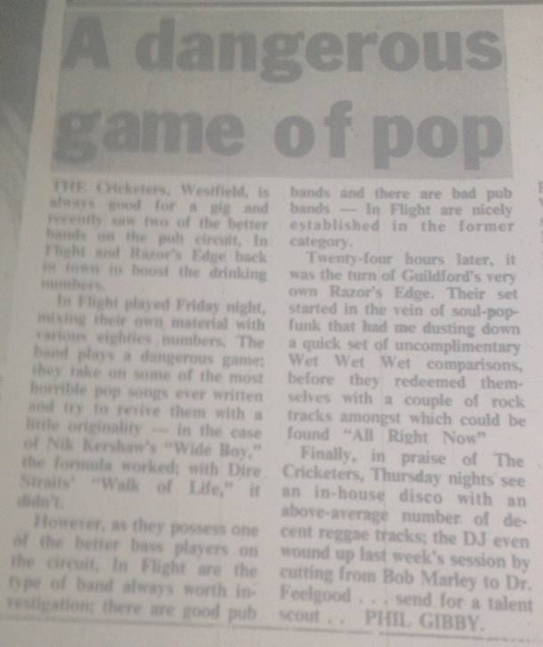 Sugar Mountain were earmarked to play Showcase ’88, but they were unable to play the date that would have been their first appearance in Woking. They appeared at The Cricks on 17 September ’88 instead. That same month saw the Herbacous Borders debuted at The Cricks, a gig reviewed in Soundscene. A Steel Bill and the Buffalos gig at the Cricketers, Westfield in ’88 was the catalyst for members of Dark, Wise Child and The Button Factory to form X-It. Around this same Killing Faith were reportedly banned from the Cricks for alleged blasphemy. Forrester and the Choppers featured a rotating list of band members that maxed out at 11 for one memorable Christmas gig at the Cricketers, Westfield in ’88, where they all managed to squeeze into the bay window stage area. An appearance at The Cricketers, Westfield, betwixt Christmas ’88 and New Year, was not – as rumoured – Calamity Sax‘s last according to the band; instead they were taking a break and they did appear again at the ABC Music sponsored Showcase ’89 on 15 July. In August of ’89 Backlash’s life ban at was lifted for a memorable gig, supported by Mr Ed. Calamity Sax however never managed a proper re-grouping and on the groups ‘official’ demise, in January 1990, Phil Brookes joined London based Scarlette, first appearing with the London band at his old Westfield haunt: The Cricketers.