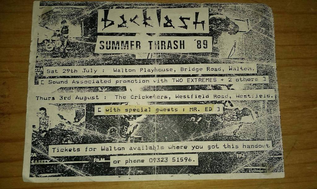 The story goes that Mr Ed’s drummer wrote the songs, but didn’t listen to music, he just “read Byron and Shelley”!. What we do know for certain is that in August ’89 Backlash’s life ban at The Cricketers, Westfield was lifted for a memorable gig, supported by Mr Ed.