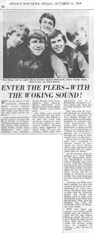 Ex-Cruisers Rock Combo, Terry Crowe & The Counts, and Nashville Teens member, Crowe (who lived on Maybury Estate, Woking) and Dunford formed ‘The Plebs’ in early ’64 with McCulloch, Sirmon and Dennis (Dennis and Sirmon were both ex-Screaming Lord Sutch and the Savages). Dennis had been looking for a new band and had put a notice up in his local music shop. Less than a week later there was McCulloch standing at Dennis’ door, inviting him to an audition. Sirmon joined in July ’64 and had previously been a member of The Conchords (who later became Mungo Jerry) and then Mike Dee & The Jaywalkers with Ritchie Blackmore..