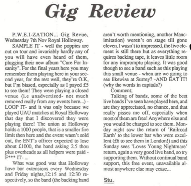 Back at UoS again in May ’92, this time supported by Trousershock BC – who are no strangers to the University themselves. The Grand, Clapham Junction hosted the band on 10 July ’92 as they, and Huge Big Massive, supported Diesel Park West. Then, in late ’92, Railroad Earth changed their name to Ringo.