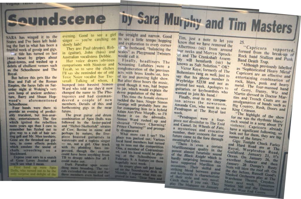 We first encountered The Spin Dolls, a four piece from Woking and West Byfleet, at the ‘Animal House’ club night at The Royal, Guildford on 21 September ’83. Four months later, on 14 January ’84, The band were supporting headliners Screaming Lullabies, with Dark Paradise, COW and at The Old Schoolhouse, Woking.