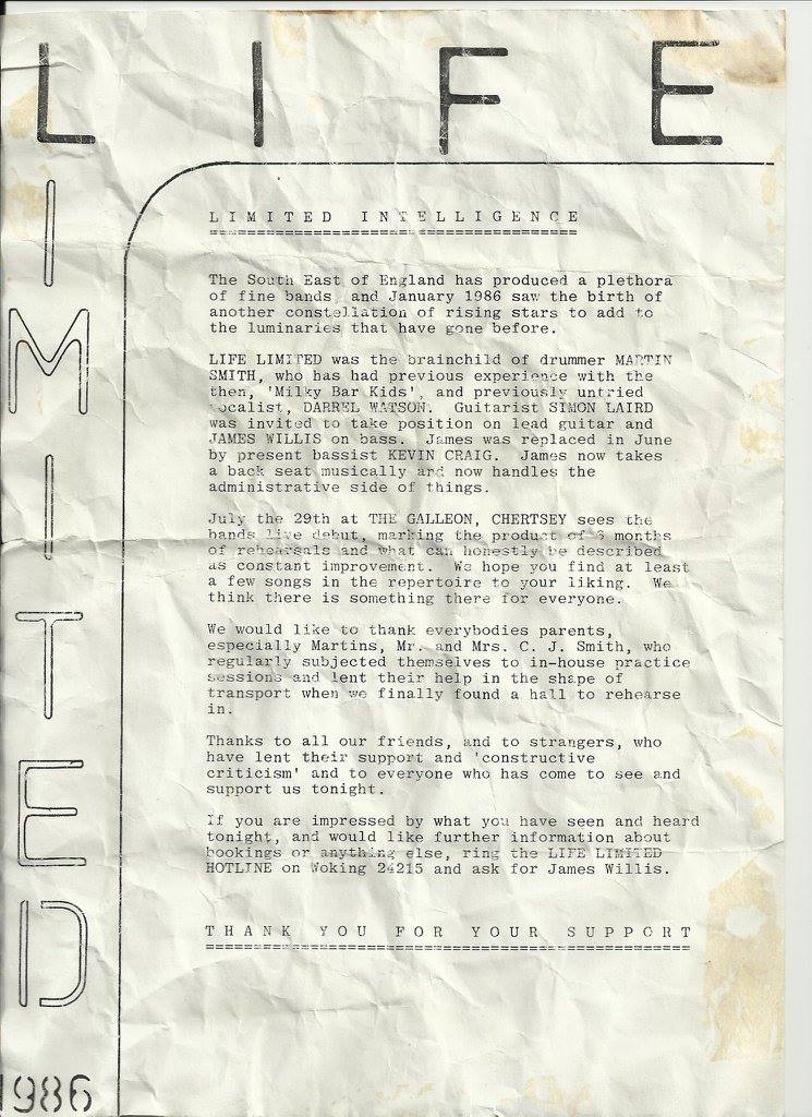 Life Limited, about to party, at Woking Scout Hut. Picture courtesy of Martin SmithLife Limited, about to party, at Woking Scout Hut. Picture courtesy of Martin SmithIt’s a Life Limited flyer from ’86. Image copurtey of Martin SmithSoundscene clipping kept by Smith’s mum. Picture courtesy of Martin SmithEarly 1986: Band pictures in the garden. Picture courtesy of Martin Smith Early 1986: Band picture in the garden. Picture courtesy of Martin Smith29 July 1986: Life Limited’s debut gig at The Galleon, Chertsey. Picture courtesy of Martin Smith.29 July 1986: Life Limited’s debut gig at The Galleon, Chertsey. Picture courtesy of Martin Smith.29 July 1986: Life Limited’s debut gig at The Galleon, Chertsey. Picture courtesy of Martin Smith29 July 1986: Life Limit’d debut gig at The Galleon, Chertsey. Picture courtesy of Martin Smith29 July 1986: Life Limited’s debut gig at The Galleon, Chertsey. Picture courtesy of Martin Smith.29 July 1986: Life Limited’s debut gig at The Galleon, Chertsey. Picture courtesy of Martin Smith.29 July 1986: Life Limited’s debut gig at The Galleon, Chertsey. Picture courtesy of Lizzie Hall29 July 1986: Life Limited groupies!!! Picture courtesy of LIzzie Hall.
