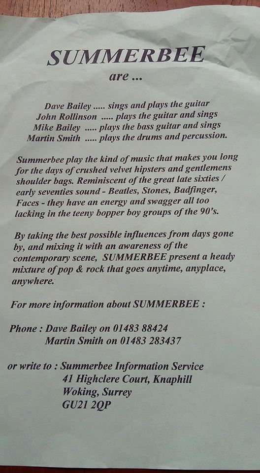 Woking based Summerbee rose from the ashes of Vox Pop, of which all four members of the band had been part, delivering a late sixties/early seventies sound. The band secured a Christmas period slot at the Cricketers, Westfield in ’94 and started appearing in London in early ’95, including St. John’s Tavern, Archway on 14 March.