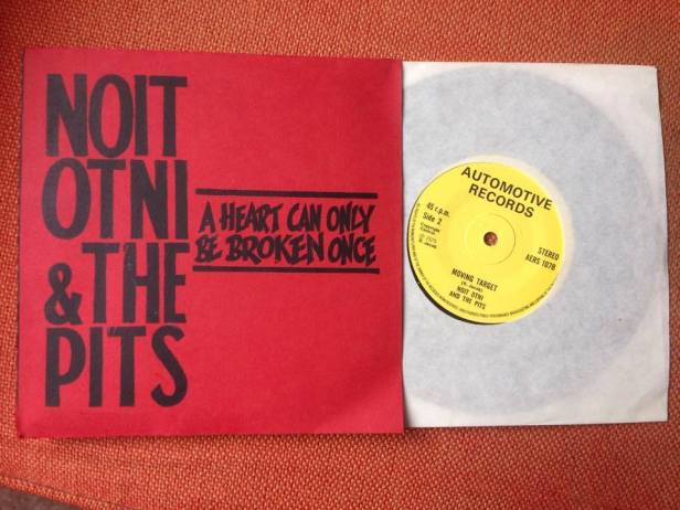When The Volunteers wrapped things up in ’79, Jacob pulled together Noit Otni & The Pits. Managed by the spurious Sydney Arbor-Bridge – it’s unclear if all the band member names above are real – the band could be seen regularly gigging in Woking and Guildford. Noit Otni released the “A Heart Can Only Be Broken Once” double A-side single in December of ’79 on Automotive Records (AERS 107) with “Moving Target” on the “B-side”.